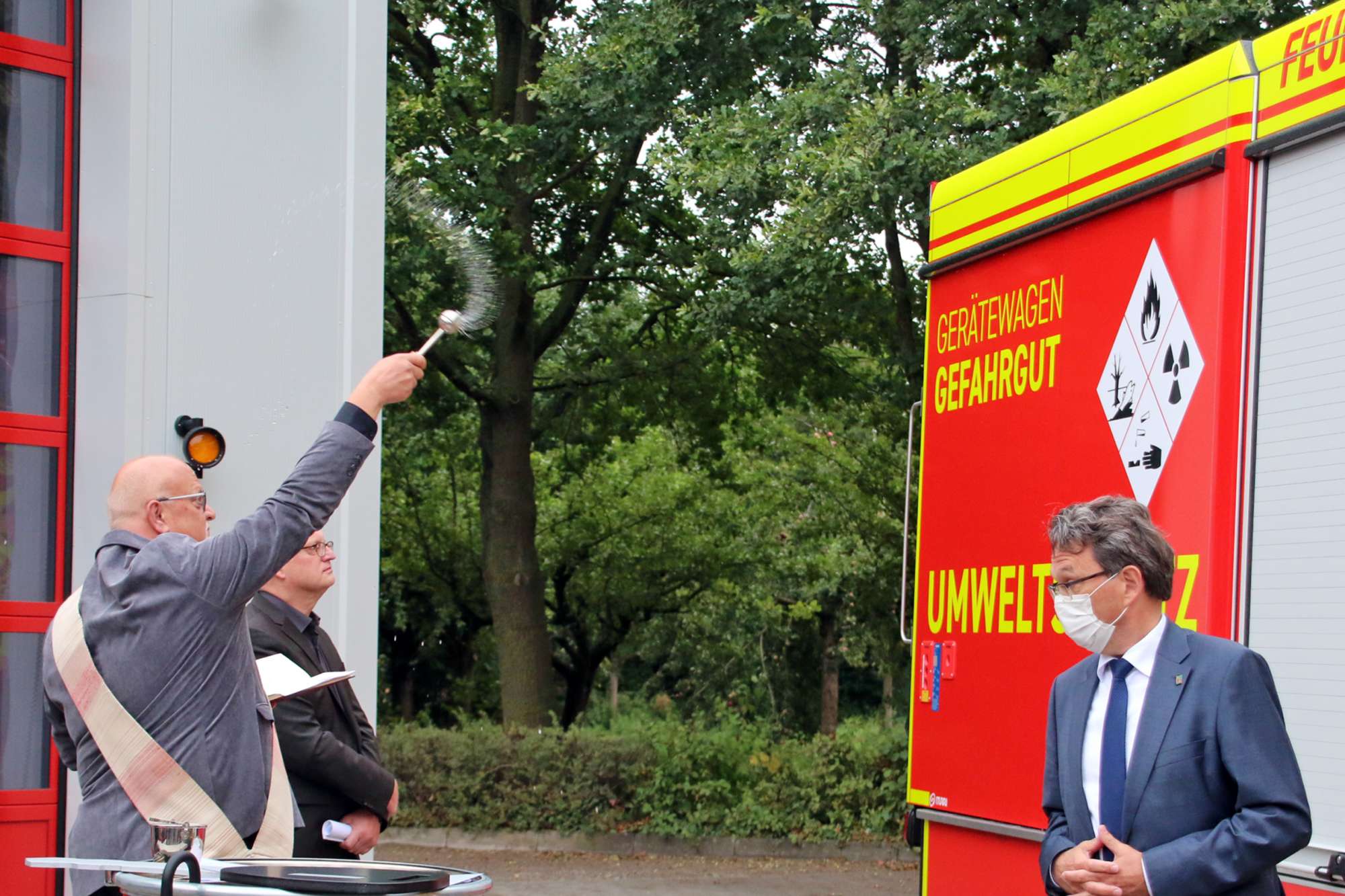 So groß ist das neue Fahrzeug für den ABC-Zug 2 auf Kreisebene, dass ans Feuerwehrhaus angebaut werden musste : „Das haben wir schon erledigt“, berichten Abteilungsleiter Tobias Trompeter und der Beigeordnete Matthias Abel von der Stadtverwaltung bei Einweihung und Fahrzeugtaufe.