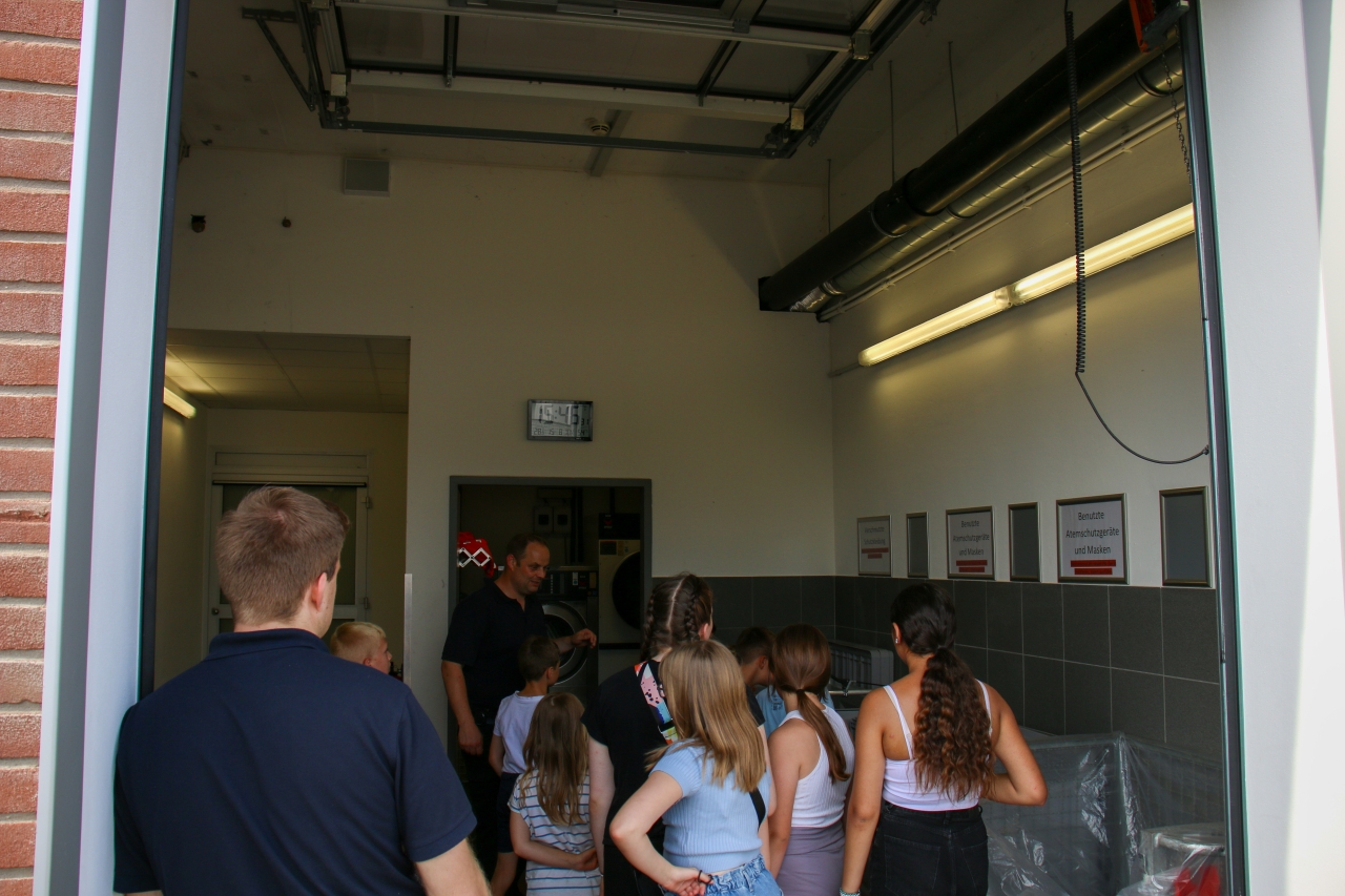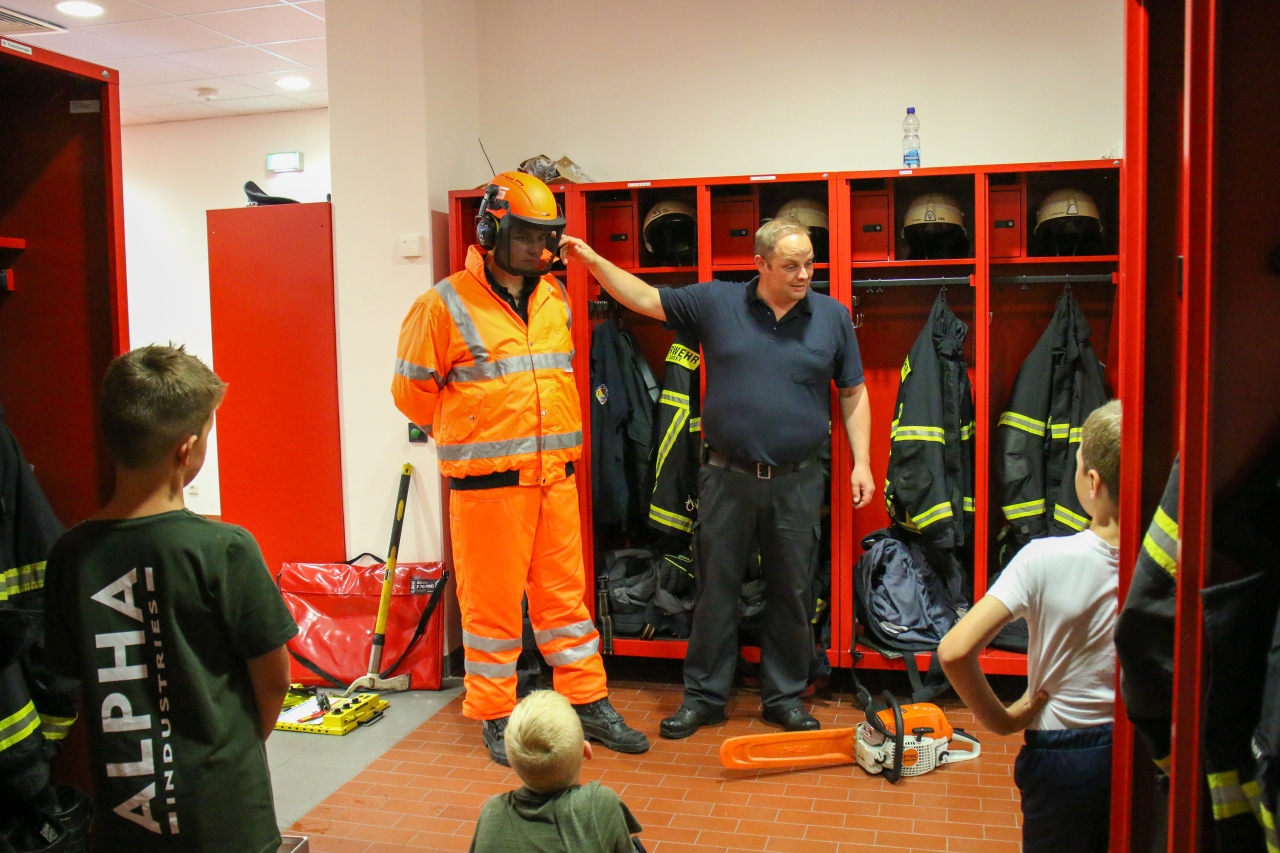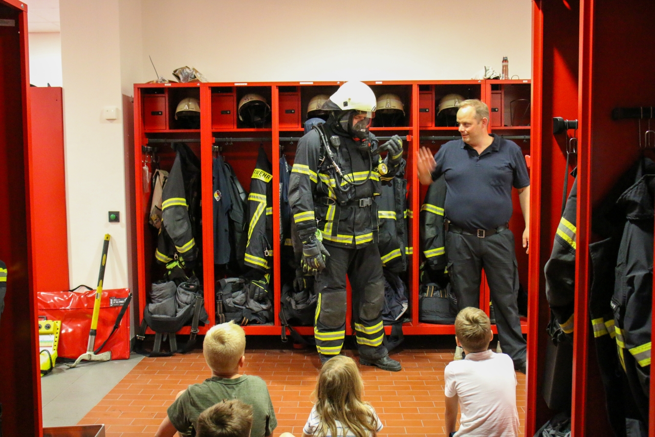 Danach ging es weiter in die Umkleide. Dort wurde den Kindern erzählt, wie ein Einsatz abläuft, welche Kleidung die Einsatzkräfte in einem Einsatz tragen und welche Ausrüstung bei einem Brandeinsatz zusätzlich benötigt wird. Zusätzlich konnten sehen, wie sich eine Einsatzkraft mit einem Atemschutzgerät ausrüstet und wie sich dann die Atemgeräusche anhören. Dies hört sich meist recht eigenartig an, doch die Kinder merkten, dass sie keine Angst haben müssen, sollten sie ein solches Geräusch hören. „Das sind die Geräusche der Feuerwehrfrauen und -männer, die euch retten wollen. Davor braucht ihr keine Angst haben“, sagte ein Feuerwehrmann.