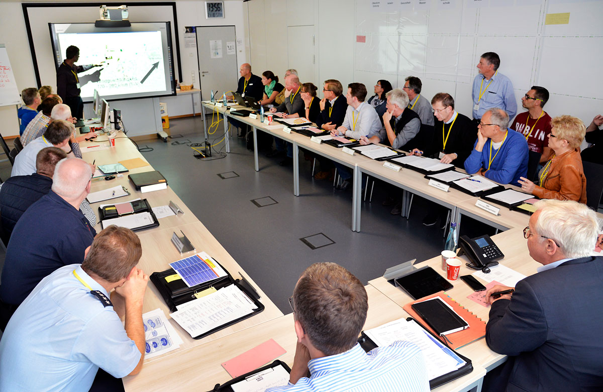 Die Beteiligten mussten sich vorstellen, welche Notfallmaßnahmen getroffen werden müssen, wie die vorhandenen Notfallpläne umgesetzt werden können und wie man die Bevölkerung über Hörfunk, Fernsehen, Social Media wie Facebook und Twitter sowie ein Bürgertelefon umfassend informiert. Diese und viele weitere Fragen mussten am Samstag in kürzester Zeit geklärt werden.