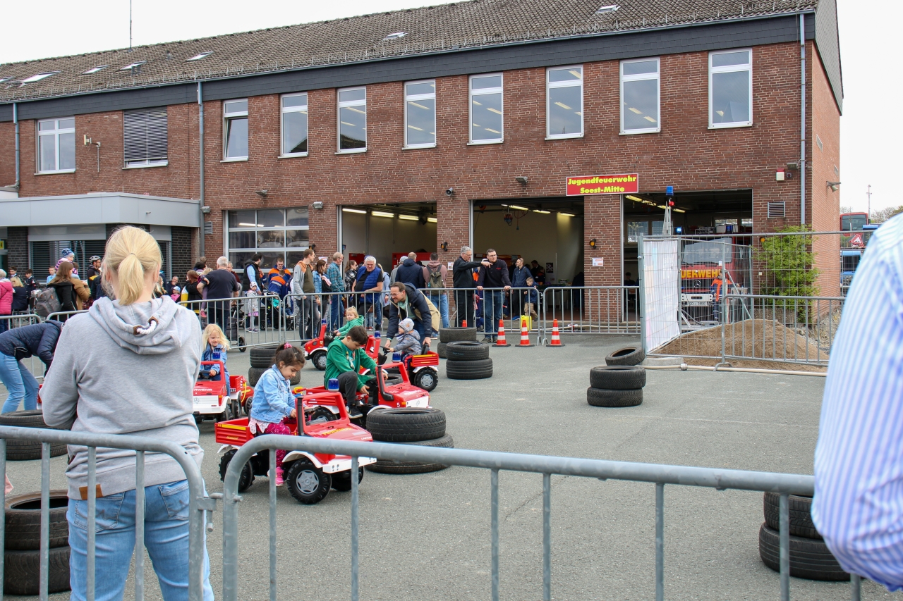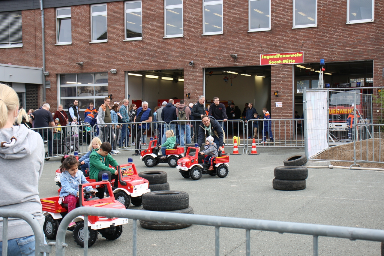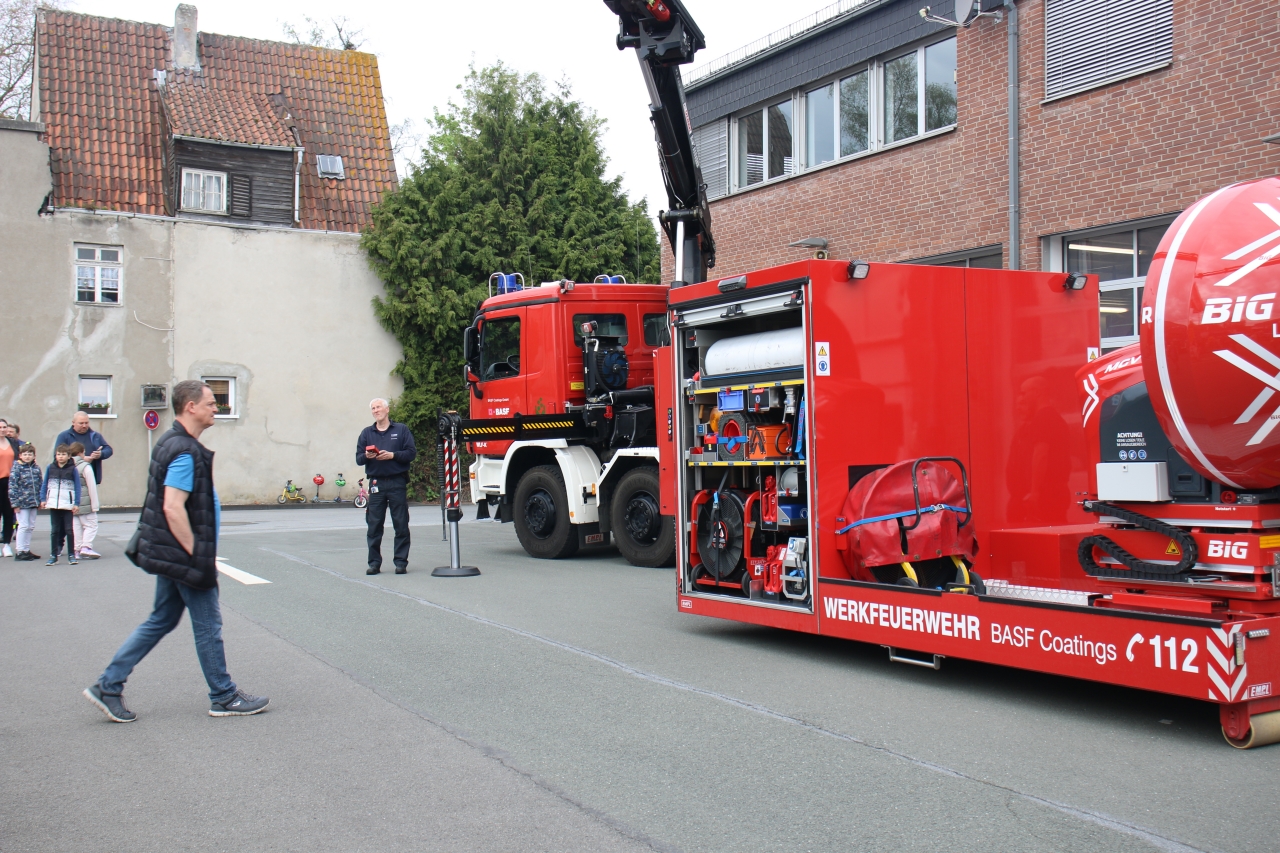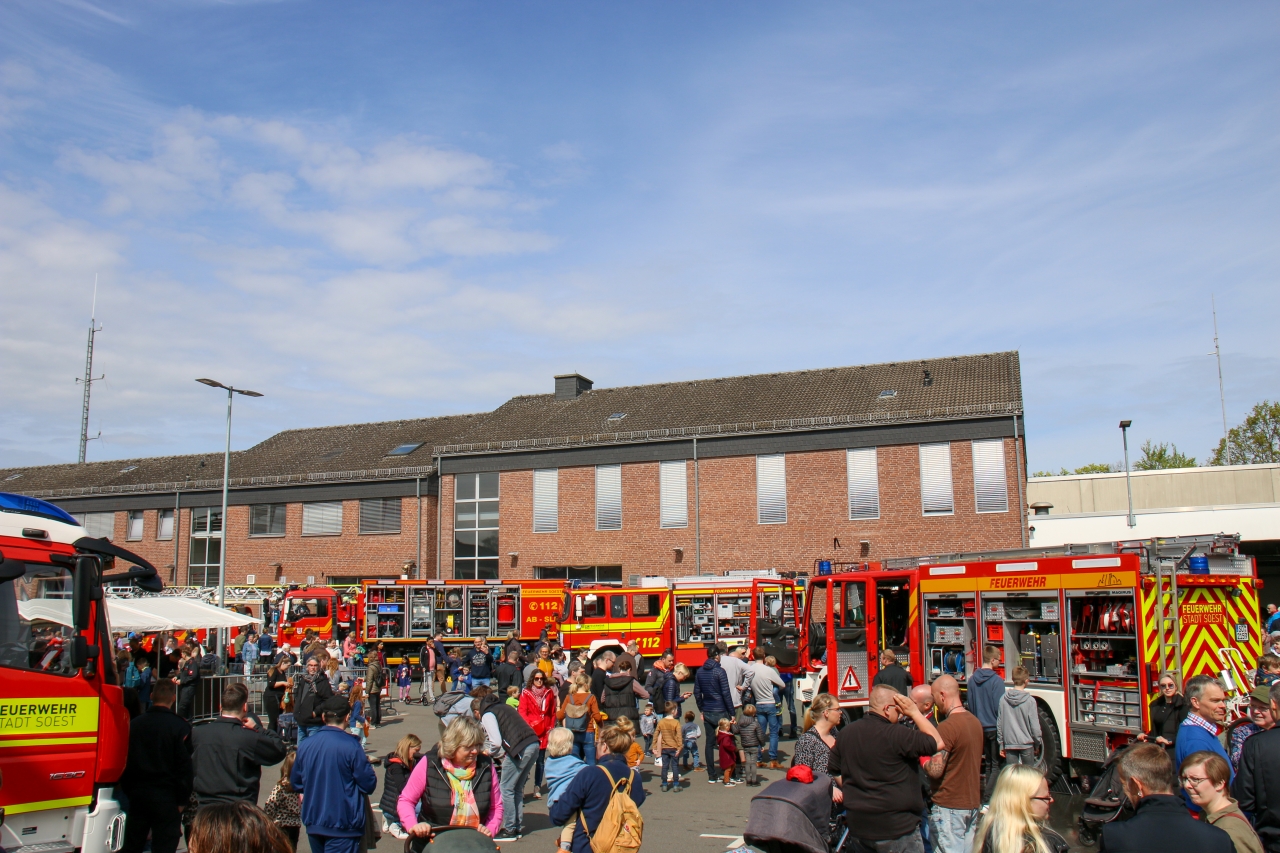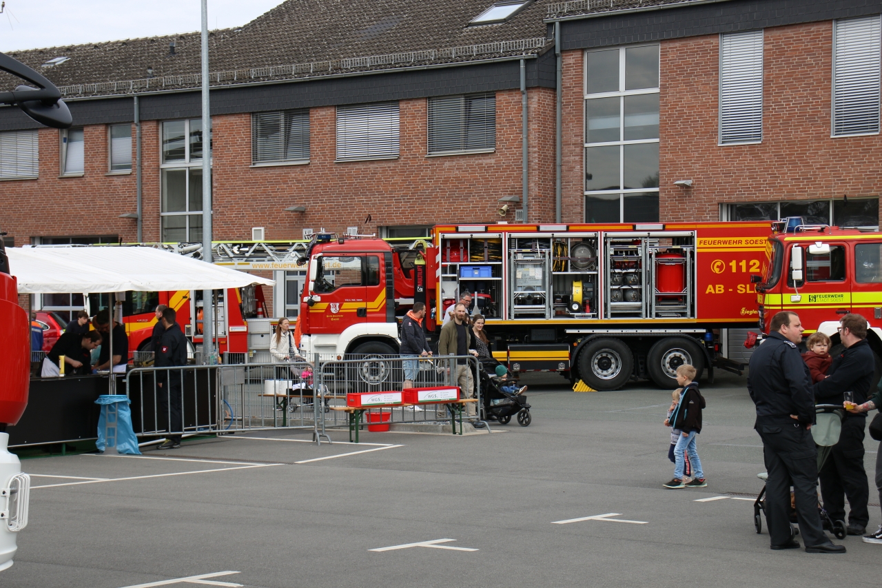 Kurz nach Beginn der Veranstaltung füllte sich der Hof der Feuerwache stetig mit Besuchern und für die gab es jede Menge zum Entdecken. Egal ob groß oder klein, es war für jeden etwas dabei. Neben drei verschiedenen Vorführungen, bei denen ein Verkehrsunfall und eine Fettbrandexplosion simuliert wurden, gab es ein Training für den Umgang mit Feuerlöschern und eine „Modenschau“, bei der die verschiedensten Schutzanzüge präsentiert wurden. Ebenfalls konnte ein Großlüfter der Werkfeuerwehr BASF aus Münster, eine Fachgruppe des THW OV Soest sowie die Drohnengruppe des Kreises Soest besichtigt werden. Doch auch für unseren kleinen Besucher*innen wurde jede Menge geboten. Unter anderem wurde eine Wachführung angeboten und beim „Entenangeln“ und einen „Löschspiel“ konnten die Kinder ihr Können und Geschick unter Beweis stellen.