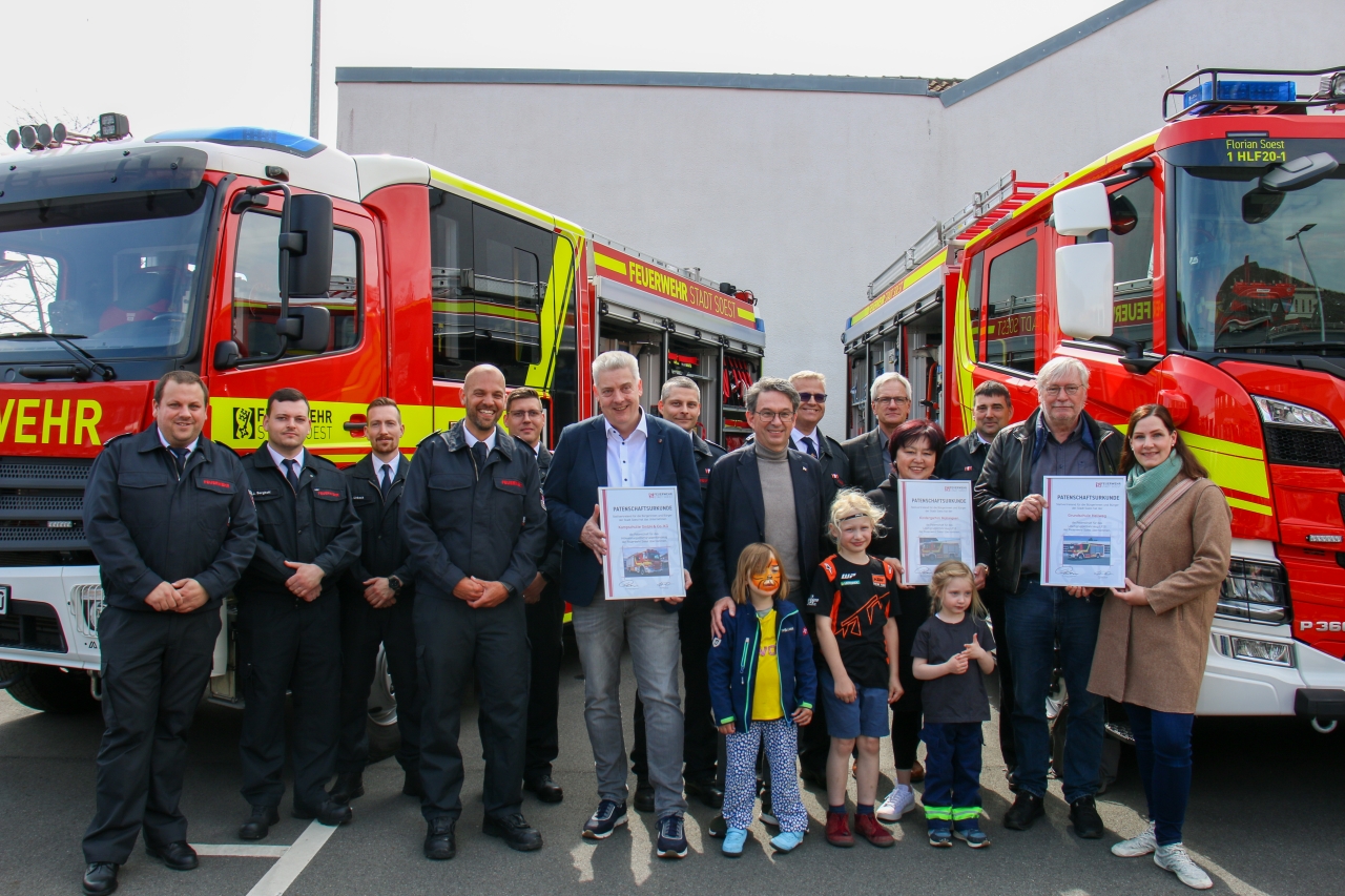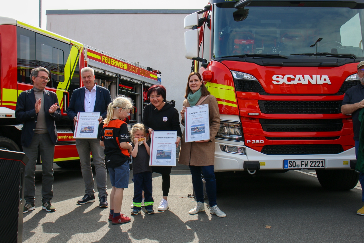 In diesem Fall waren es die Firma Kampschulte aus Soest, der Kindergarten Müllingsen und die Hellweg Grundschule aus Ampen, die jeweils die Patenschaft für eins der drei Neufahrzeug übernommen haben.