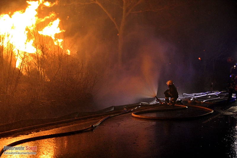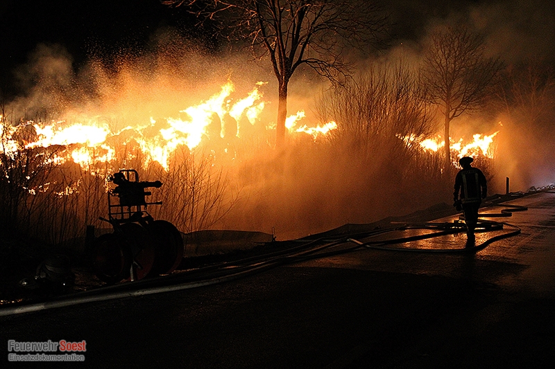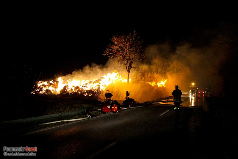 Bei Eintreffen des A-Dienstes brannten ca. 400 bis 450 Rundballen am Fahrbahnrand der Schützenstraße in voller Ausdehnung. Teilweise hatte das Feuer durch den starken Wind bereits auf Strauchwerk und angrenzende Bäume übergegriffen. Aufgrund des starken Funkenfluges und damit einhergehend einer Gefahr der Brandausbreitung auf ein gegenüber liegendes landwirtschaftliches Gebäude wurden zunächst vier C-Hohlstrahlrohre vorgenommen. Diese sind im Laufe des Einsatzes durch vier Hydroschilder ersetzt worden. Die starke Rauchentwicklung führte zur Vollsperrung des Meiningser Weges bis gegen 09:00 Uhr. Die Strohballen wurden kontrolliert abgebrannt.