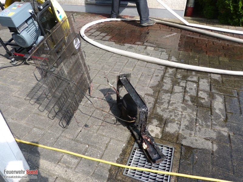 Ein brennender Kühlschrank im Keller wurde von einem Trupp unter Atemschutz mittels C-Rohr abgelöscht und nach draußen gebracht. Der betroffene Bereich wurde anschließend mittels Hochleistungslüfter belüftet.