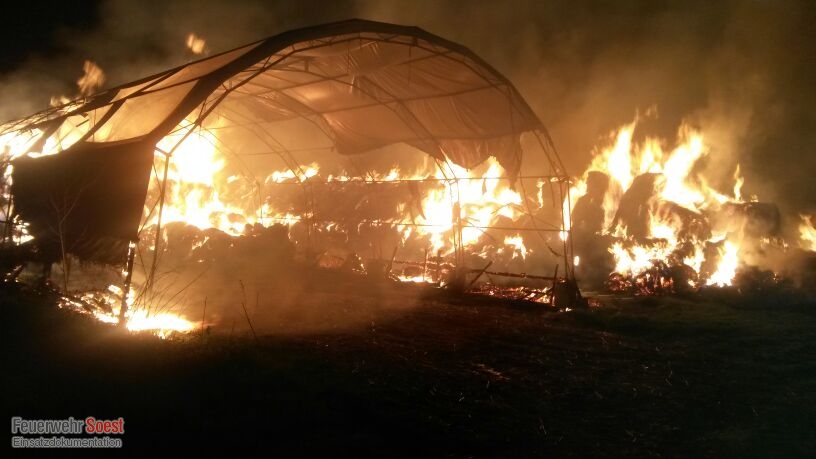 Auf einem Feld brannten bei Eintreffen der Feuerwehr ca. 500 Strohballen in voller Ausdehnung. Um ein Eventuelles übergriefen auf angrenzendes Buschwerk, bei einer Veränderung der Windrichtung, zu vermeiden wurden zwei Riegelstellungen aufgebaut. Die Feuerwehr ließ die Rundballen kontrolliert herunterbrennen.