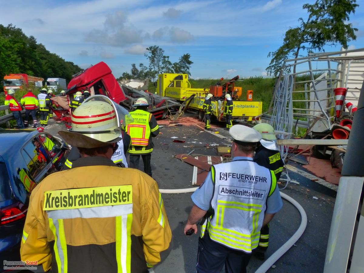 Die Feuerwehr befreite den eingeklemmten LKW Fahrer, mehrere Verletzte wurden durch den Rettungsdienst versorgt.