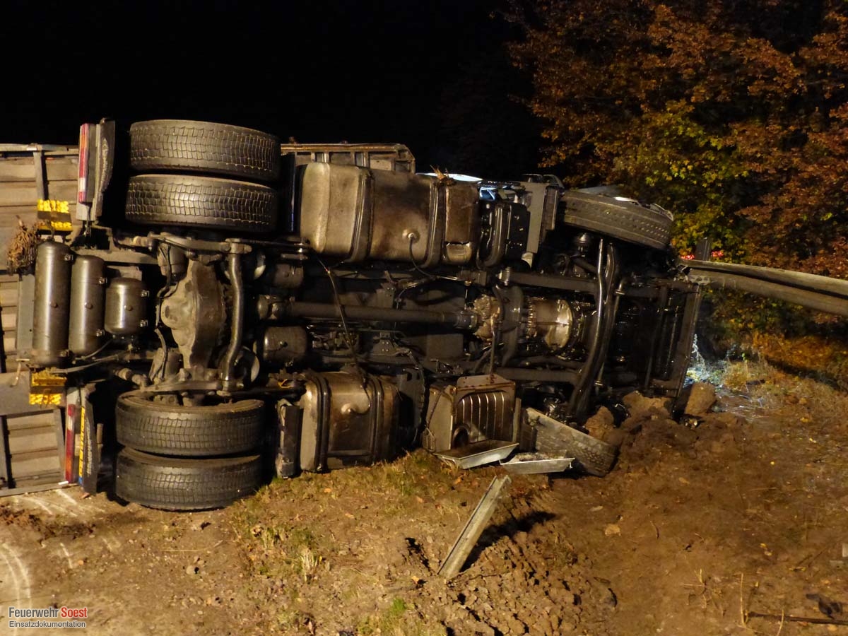 Ein LKW war bei einem Alleinunfall auf die Seite gekippt und blieb quer auf der Fahrbahn liegen. Der Fahrer blieb glücklicherweise unverletzt und konnte sich eigenständig befreien. Die Aufgaben der Feuerwehr beschränkten sich auf das Abstreuen der ausgelaufenden Betriebsmittel, sowie Sicherstellung des Brandschutzes.