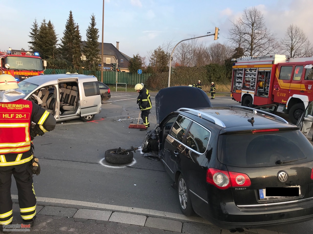 Im Kreuzungsbereich waren 2 Fahrzeuge zusammengestoßen, drei weitere Fahrzeuge waren ebenfalls beteiligt. Die Leitstelle alarmierte daraufhin Rettungsmittel nach Stichwort MANV1 (Massenanfall von Verletzten) sowie die Feuerwehr. In beiden Fahrzeugen waren die Fahrer eingeschlossen und mussten durch die Feuerwehr mit hydraulischem Rettungsgerät befreit werden.