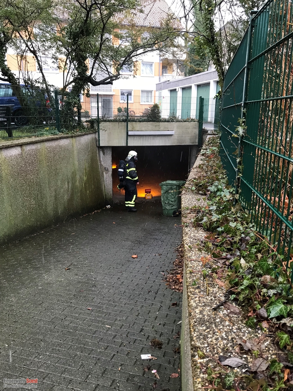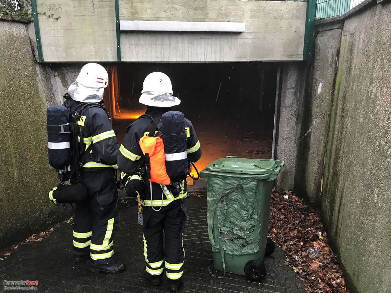 In einer Tiefgarage brannten gelbe Säcke. Die Feuerwehr ging mit einem C-Rohr vor, anschließend wurde die Tiefgarage mit einem Großraumlüfter gelüftet.