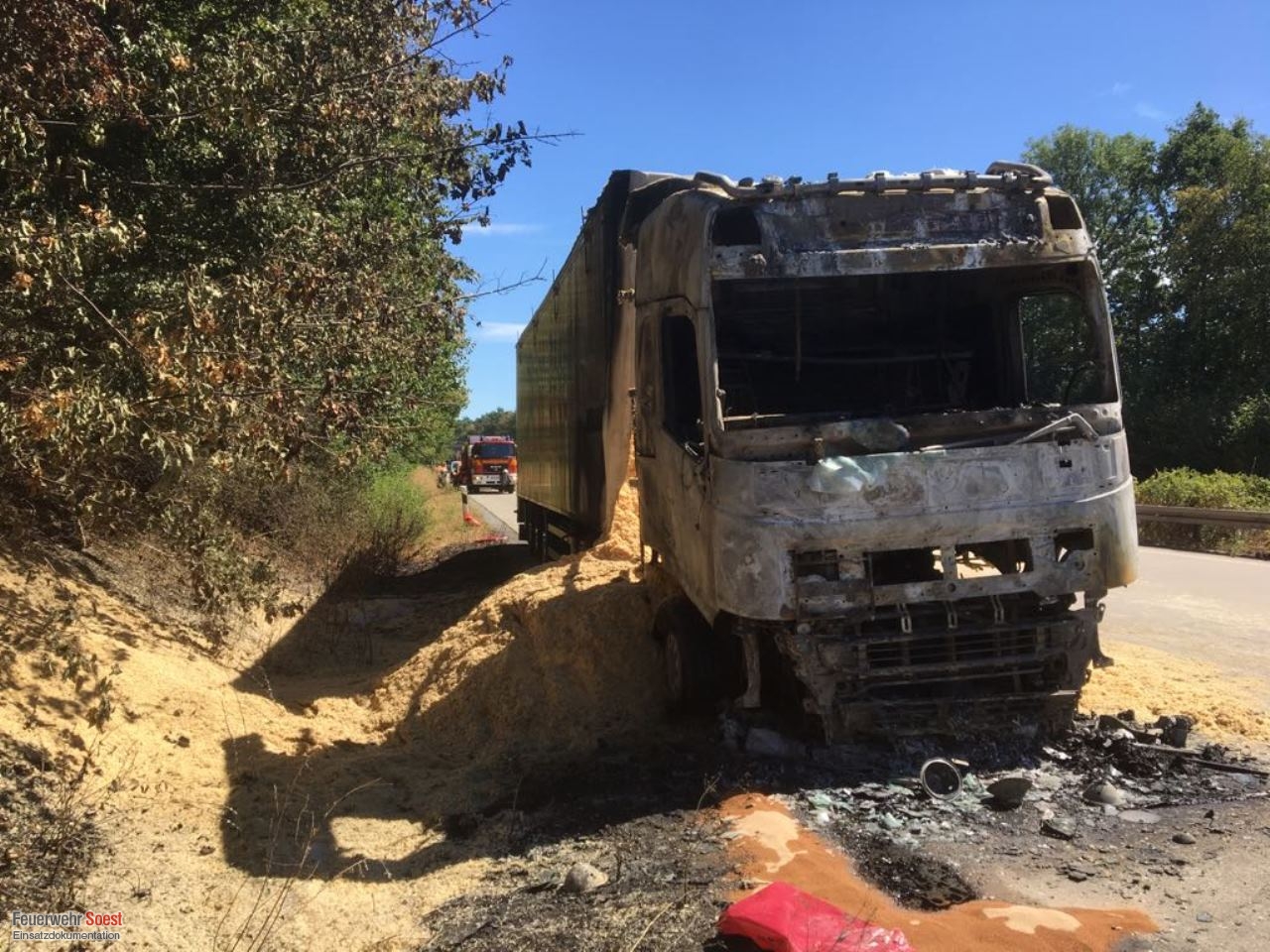 Dort brannte das Fahrerhaus eines Sattelzuges, der Holzspäne geladen hatte. Das Feuer durchbrach die Stirnwand des Aufliegers und setzte die Ladung in Brand.