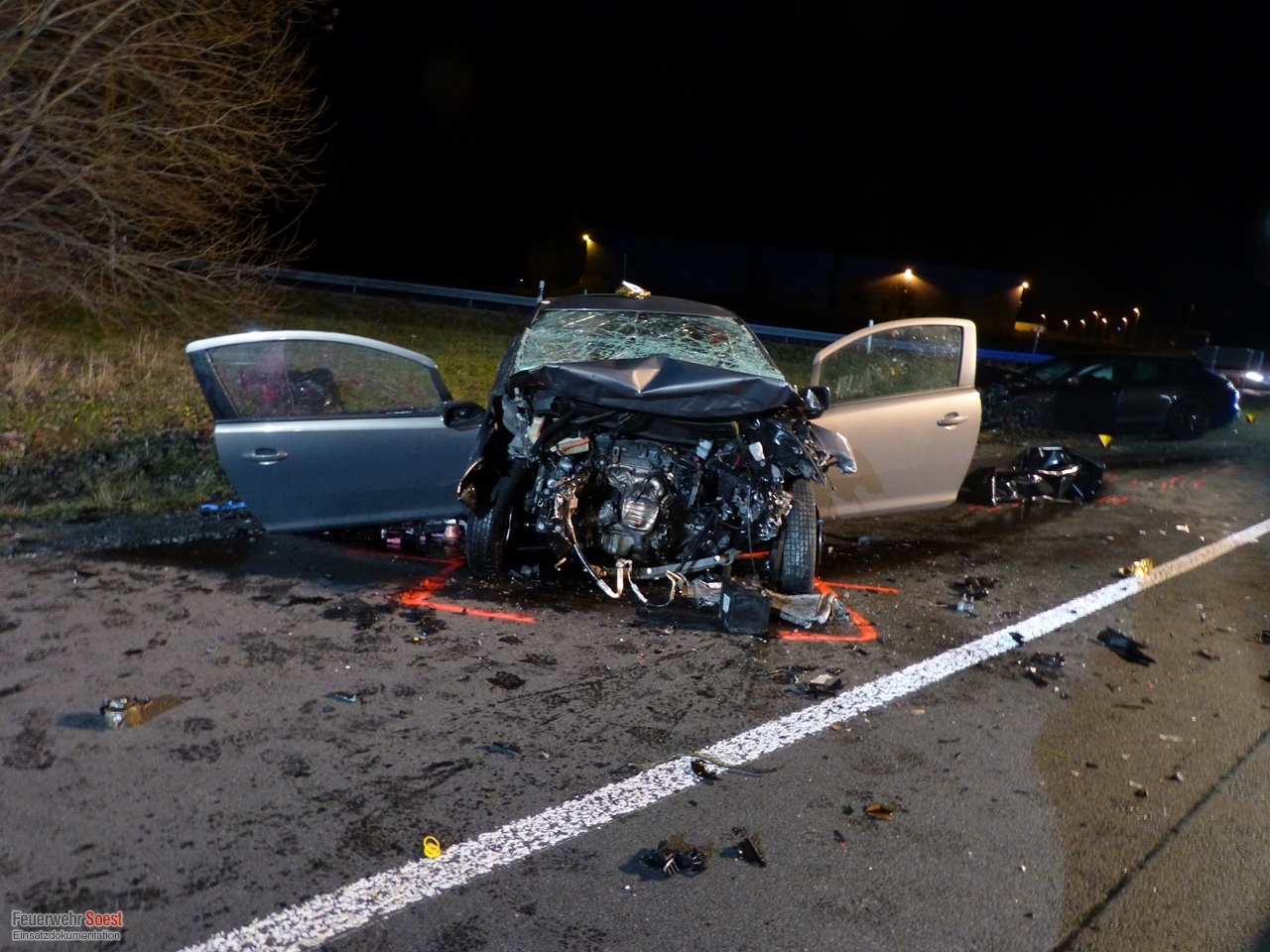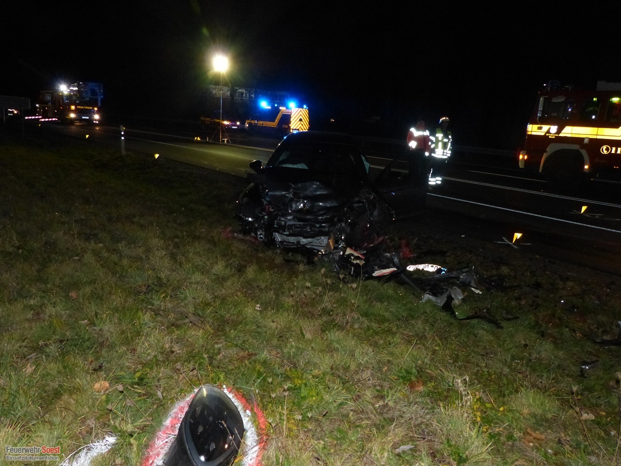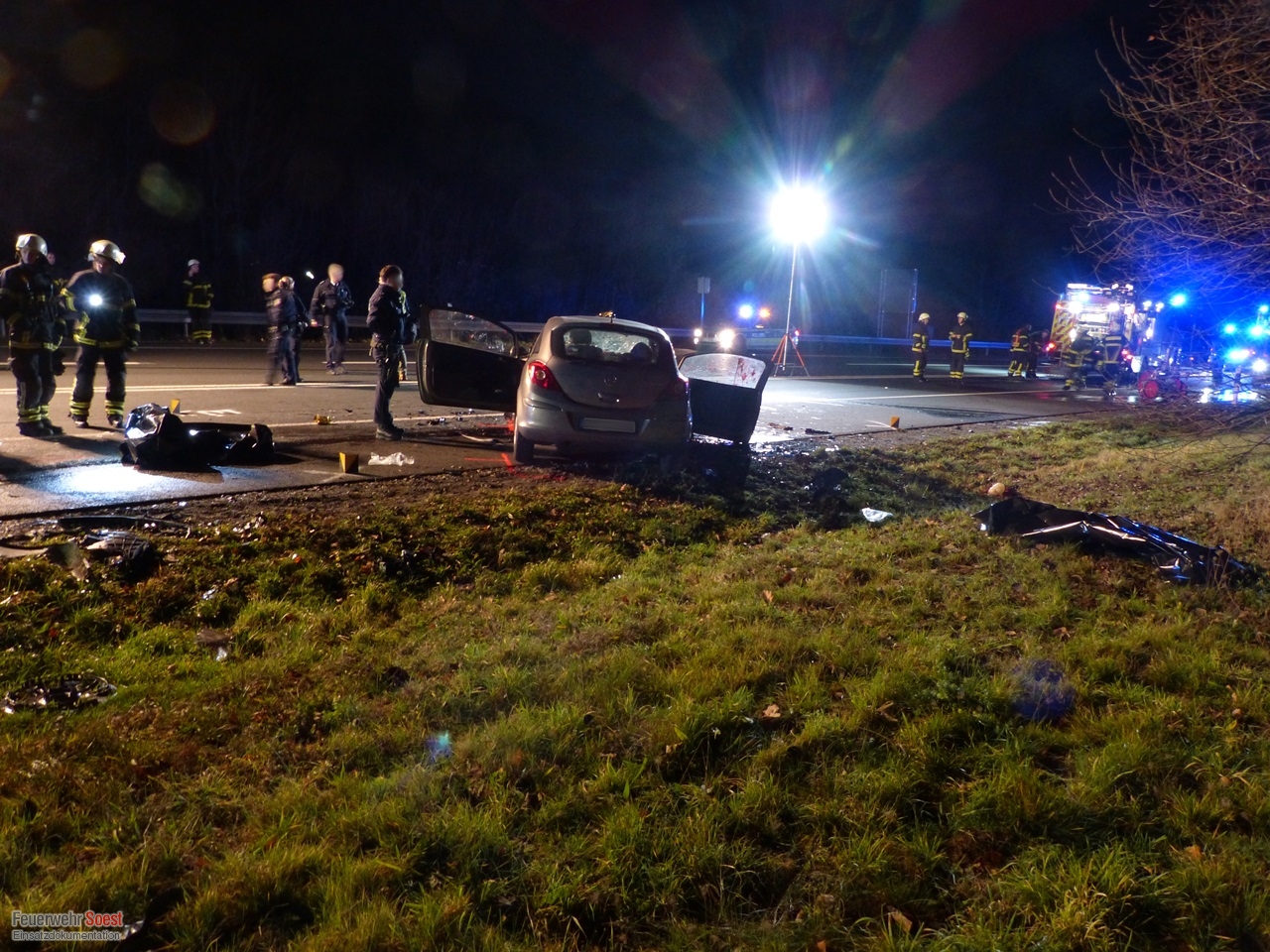 Bei einem schweren Verkehrsunfall wurden 2 Personen in ihrem Fahrzeug eingeklemmt. Nachdem die eigentliche Aufgabe der Feuerwehr beendet war, wurde die Einsatzstelle noch weiter für die Polizei ausgeleuchtet. Für die Fotoaufnahmen der Polizei, unterstützten wir mit unserer Drehleiter.