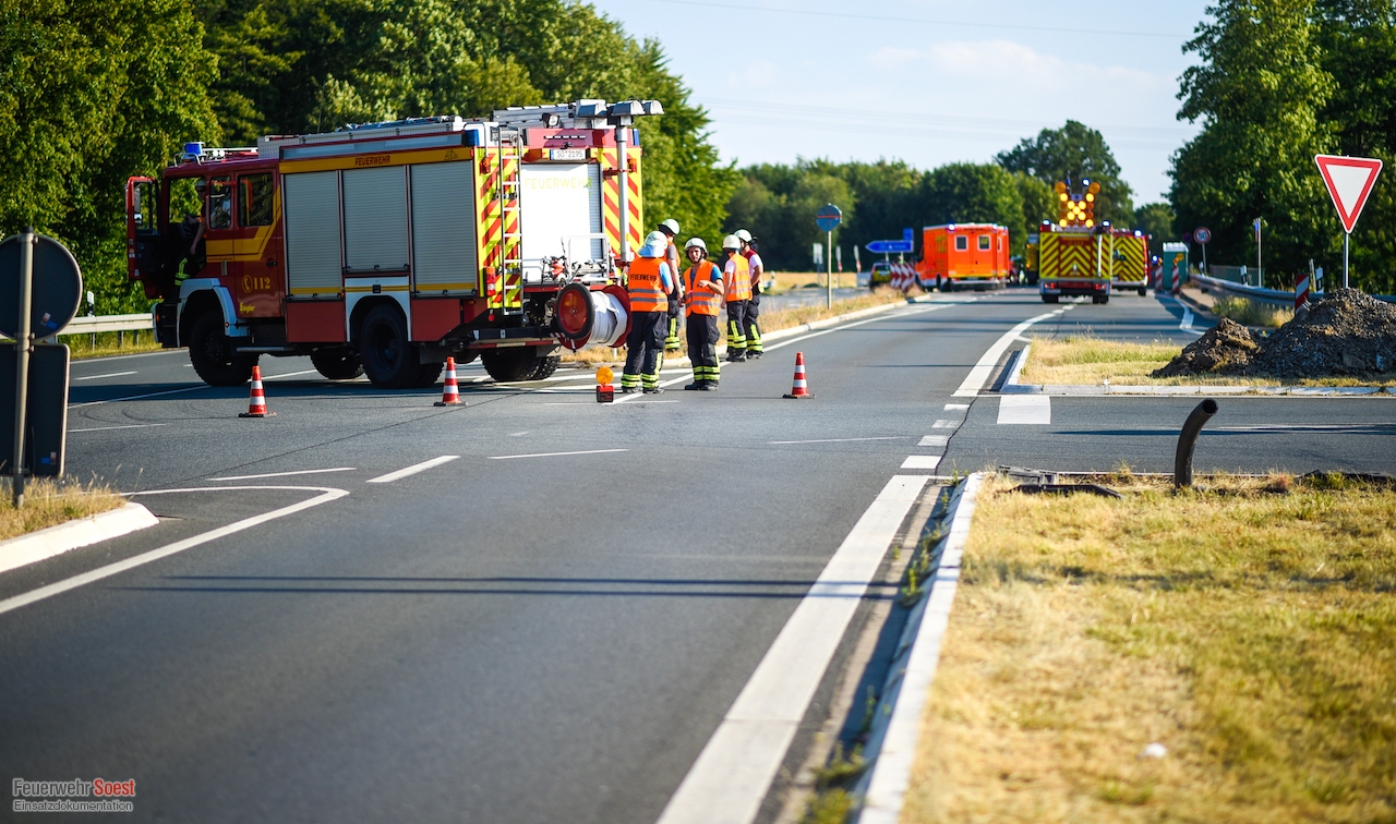 Die Feuerwehr Soest rückte mit einem Innenstadtzug, rund 25 Einsatzkräften und sechs Fahrzeugen an. Die Feuerwehrleute unterstützen zunächst bei den Rettungsarbeiten. Zudem wurden die Batterien der Fahrzeuge abgeklemmt, um die Brandgefahr zu mindern. Ein Feuerwehrmann hielt sich unter Atemschutz mit einem C-Rohr in Bereitstellung, um einen möglichen Pkw-Brand umgehend löschen zu können.