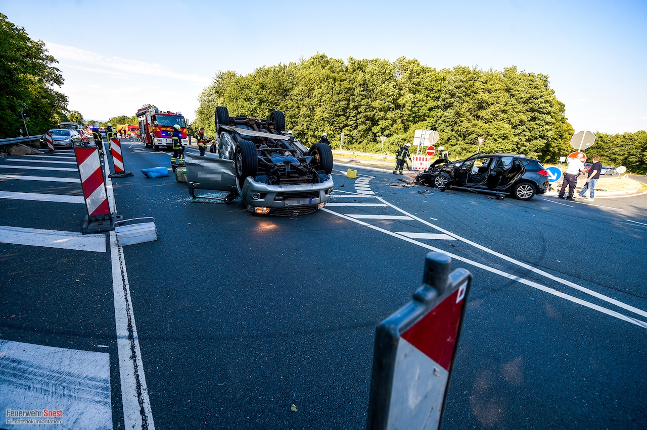 Im Bereich der Autobahn-Abfahrt Soest/Möhnesee an der Arnsberger Straße waren ein Pickup und ein Kia-Kleinwagen miteinander kollidiert. Der Pickup überschlug sich und blieb auf dem Dach liegen. Insgesamt wurden vier Personen verletzt. [...]