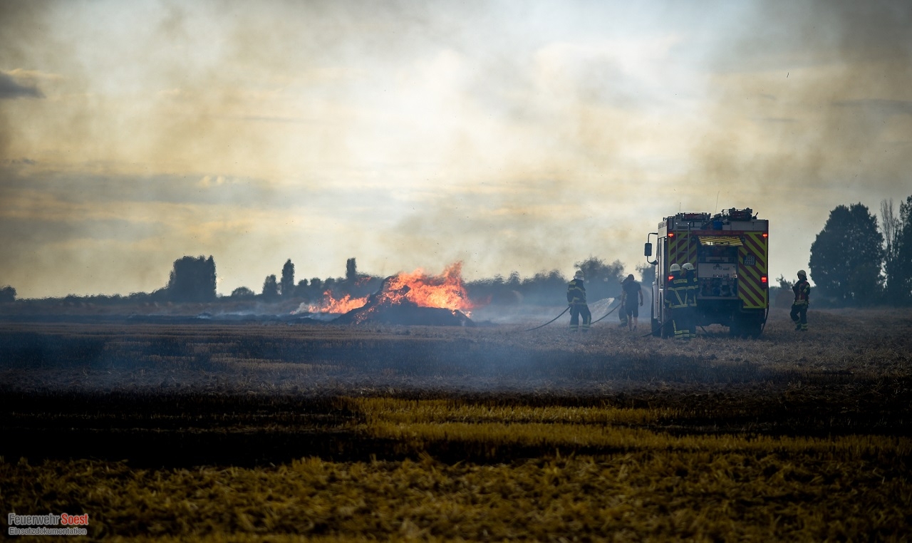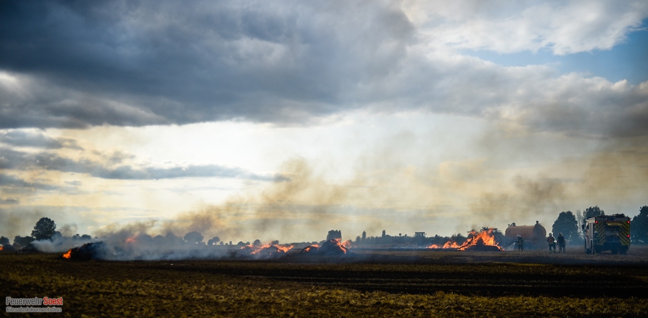 Wir wurden zu einer brennenden Rundballenpresse auf einem Feld alarmiert. Bereits bei Eintreffen der ersten Einheiten hatte sich das Feuer auf das Stoppelfeld und die darauf abgelegten Rundballen ausgebreitet. Um eine Brandausbreitung zu verhindern, wurden mehrere C-Rohre vorgenommen. Hierbei wurden wir ebenfalls durch die örtlichen Landwirte unterstützt, die mithilfe landwirtschaftlicher Geräte Brandschneisen in das Feld zogen. Im Anschluss wurde die Rundballenpresse abgelöscht. Insgesamt stand eine Fläche von ca. 4.000 m² in Brand.
