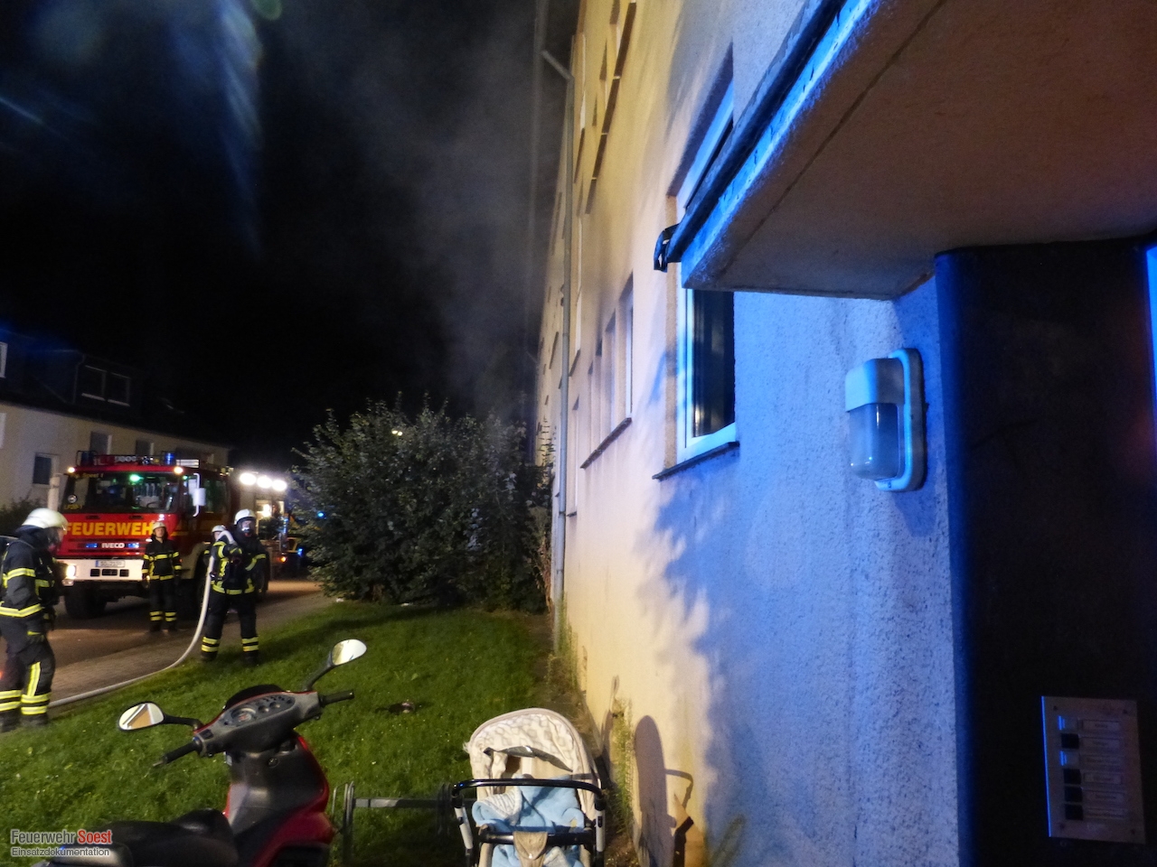 Gegen 02:55 Uhr wurden durch die Rettungsleitstelle die beiden Löschzüge der Innenstadt zu einem gemeldeten Küchenbrand alarmiert. Über Funk wurde den ehrenamtlichen Kräften mitgeteilt, dass sich noch Personen im Gebäude aufhalten sollen. Beim Eintreffen der ersten Kräfte drang bereits schwarzer Rauch aus den Fenstern der Wohnung. Umgehend wurde ein Trupp unter schwerem Atemschutz zur Brandbekämpfung in die Brandwohnung geschickt. Zusätzlich wurde ein weiterer Trupp damit beauftragt, die darüber liegenden Wohnungen zu kontrollieren. So konnte sichergestellt werden, dass alle Bewohner das Mehrfamilienhaus verlassen haben. Glücklicherweise war dies der Fall und es hielt sich niemand mehr im Gebäude auf.