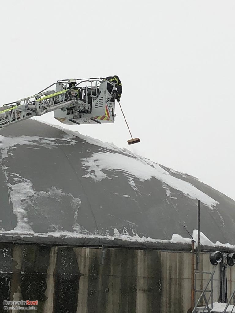 In Welver-Recklingsen drohte das Dach einer Biogasanlage durch die hohe Last von Eis und Schnee einzubrechen. In mühevoller Arbeit und bei eisigen Temperaturen, wurde die Plane aus dem Korb der Drehleiter abgeräumt und konnte wieder ihre ursprüngliche Form einnehmen.