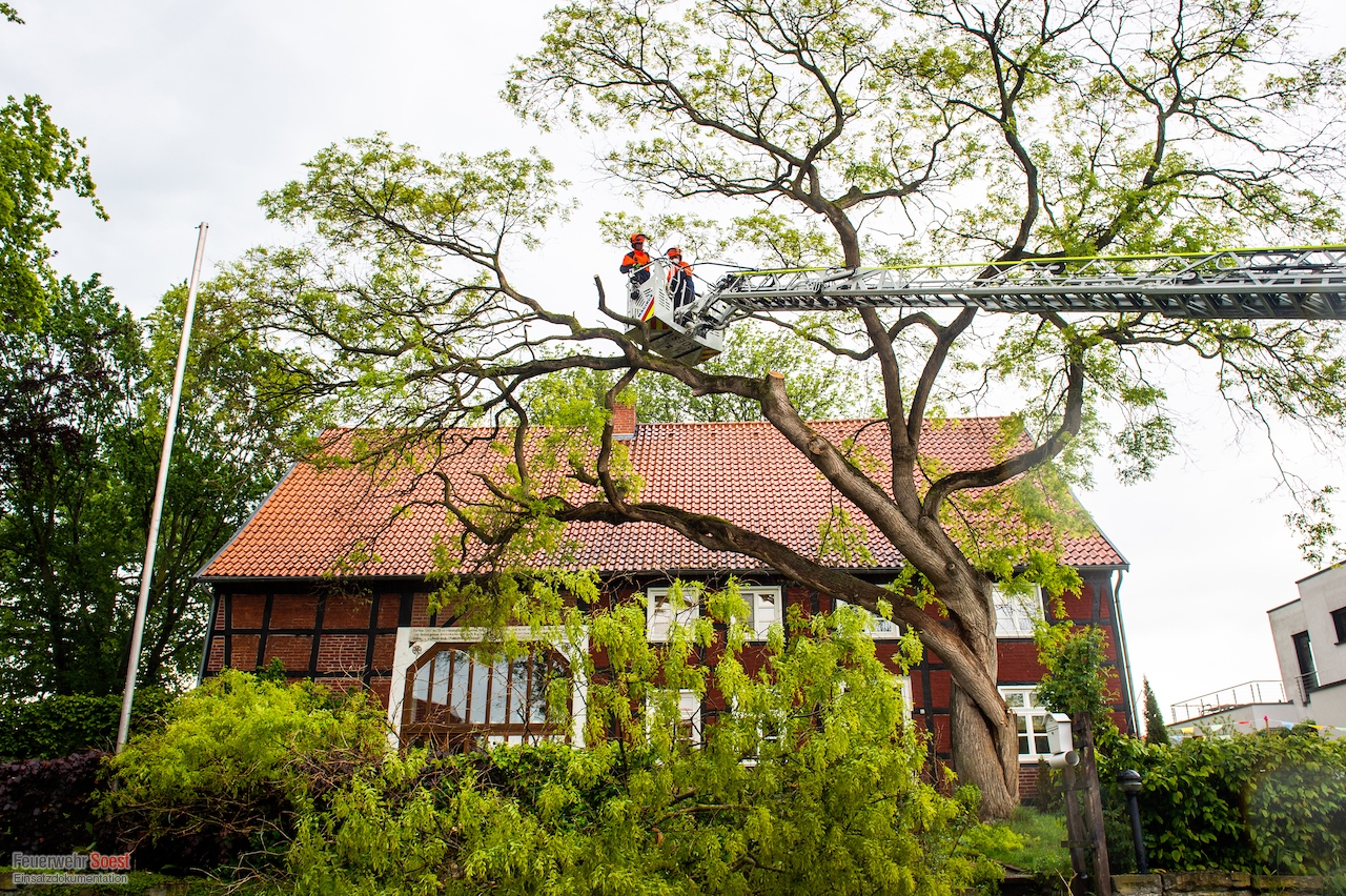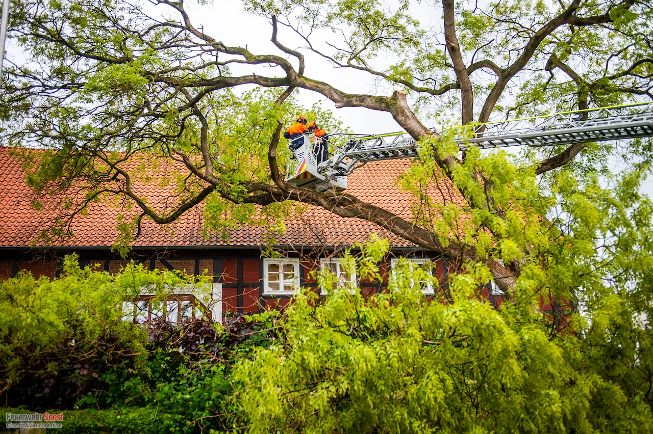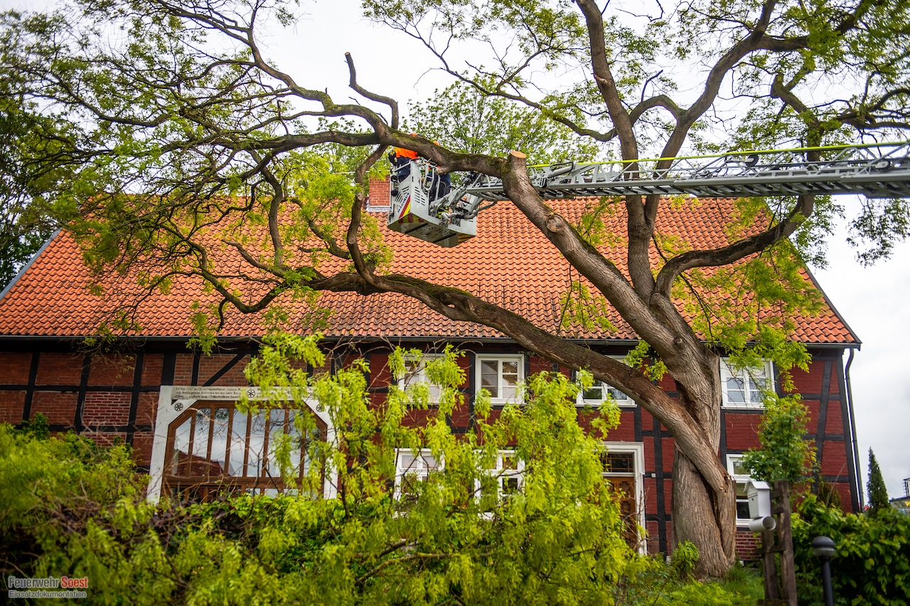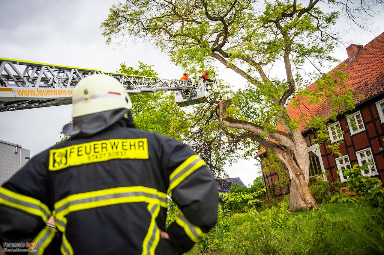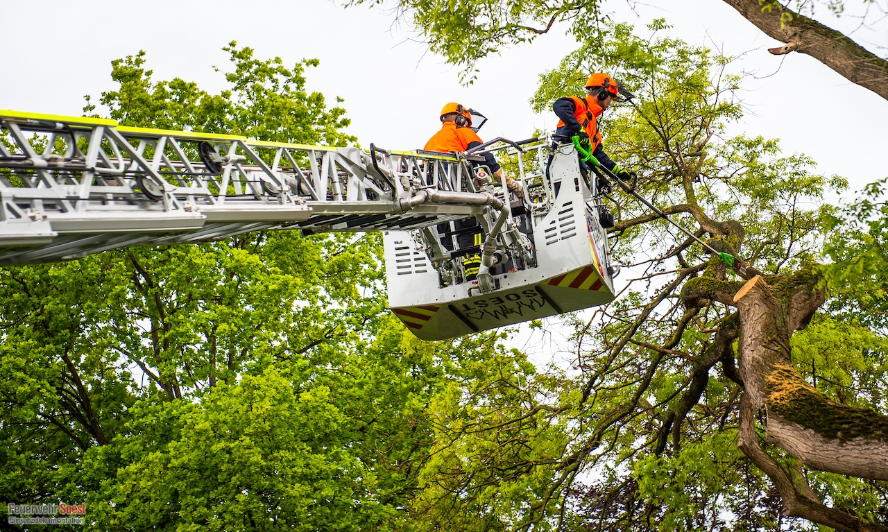 Nach einer stärkeren Sturmböe brach ein Baumstamm und drohte auf ein Fachwerkhaus zu stürzen. Der Baum wurde mittels Kettensäge uns der Drehleiter abgetragen.