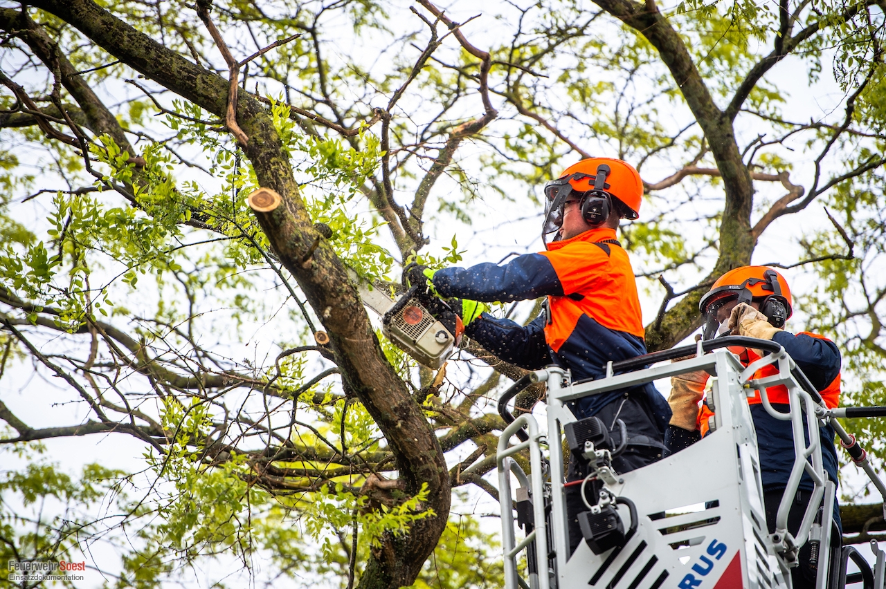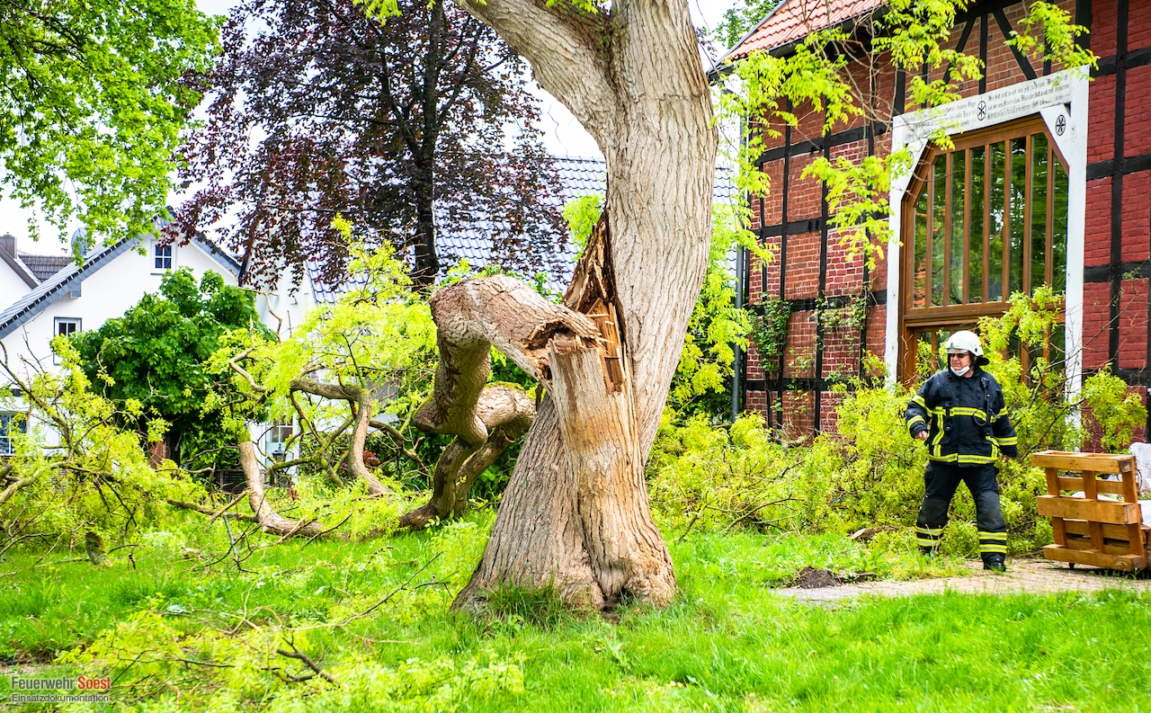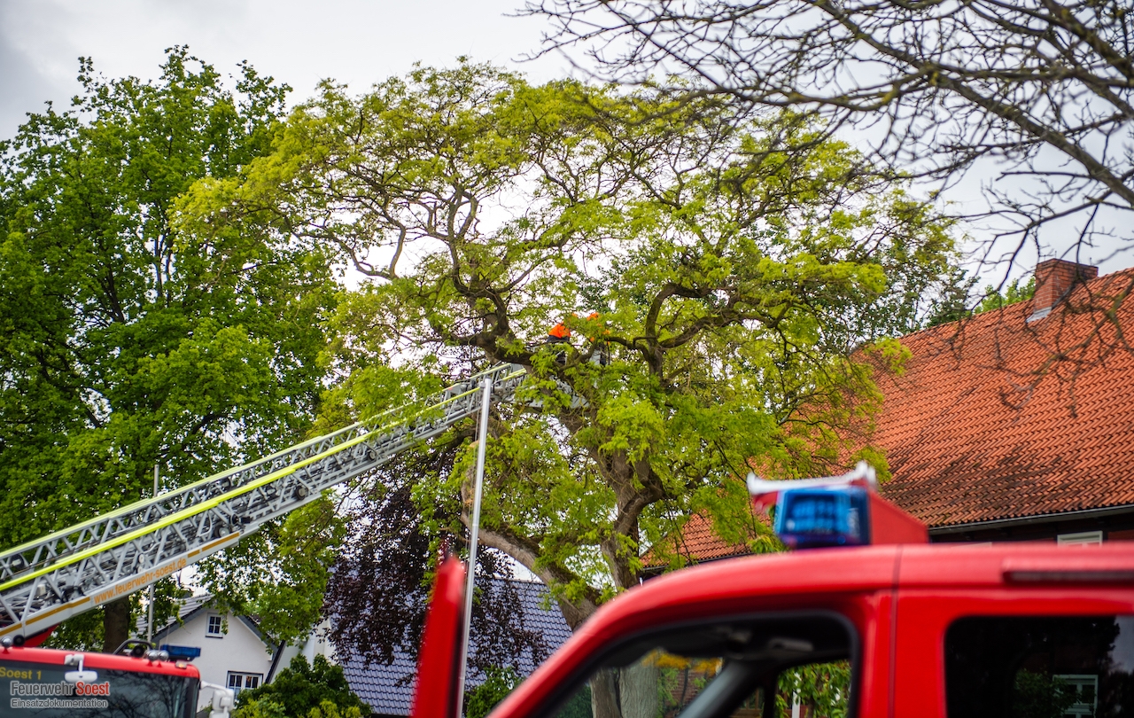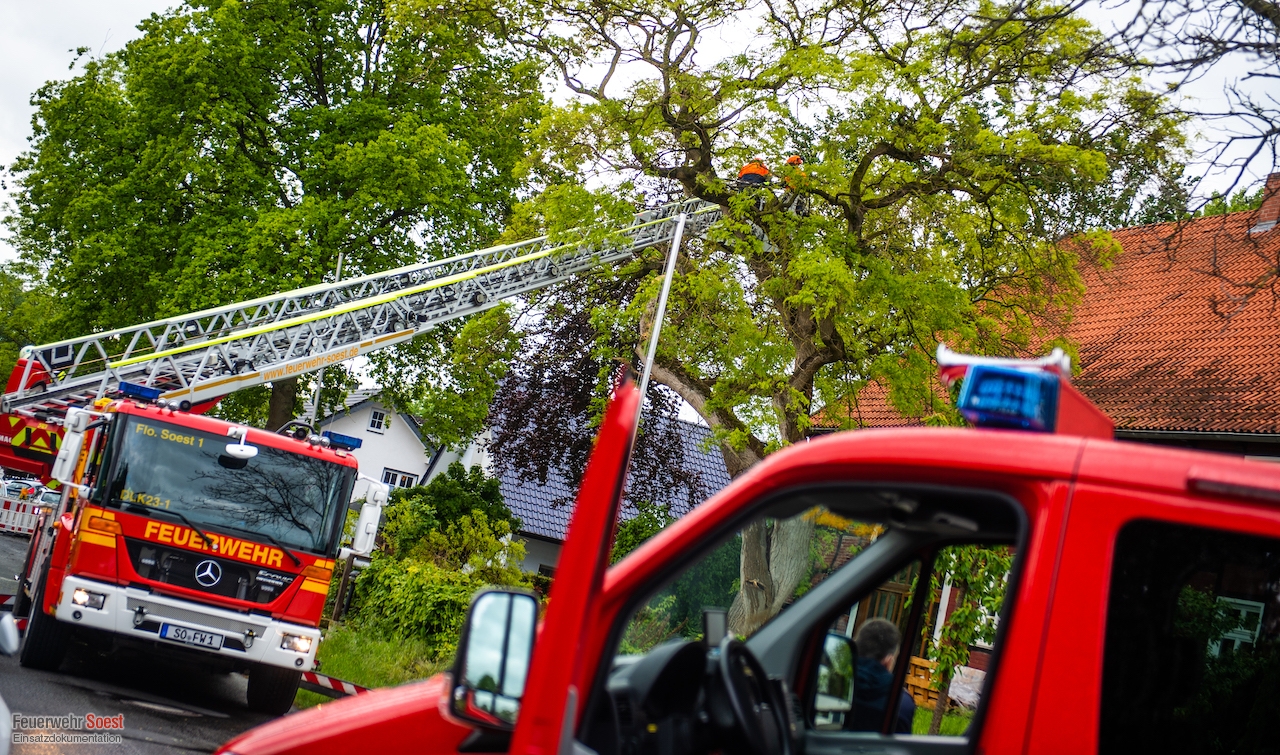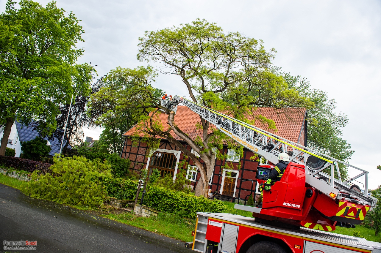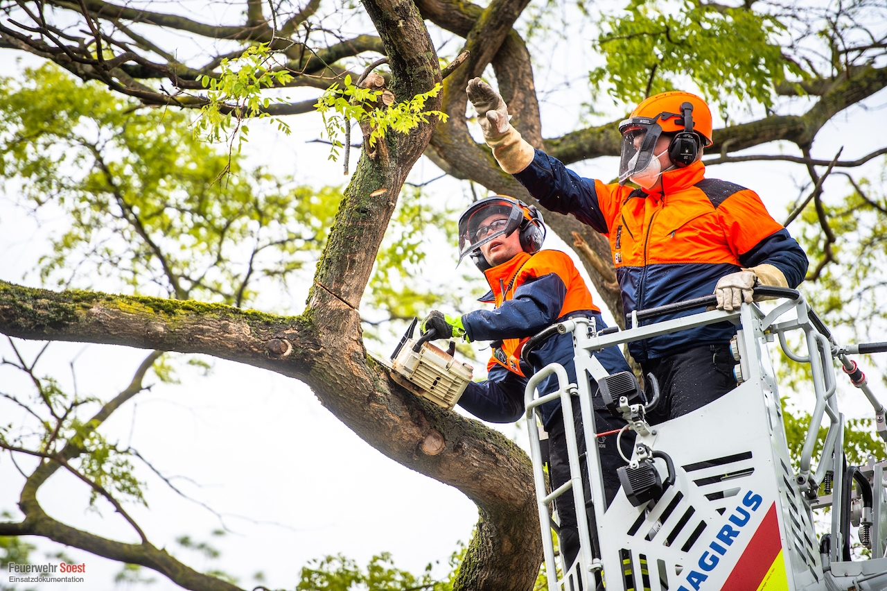 Nach einer stärkeren Sturmböe brach ein Baumstamm und drohte auf ein Fachwerkhaus zu stürzen. Der Baum wurde mittels Kettensäge uns der Drehleiter abgetragen.