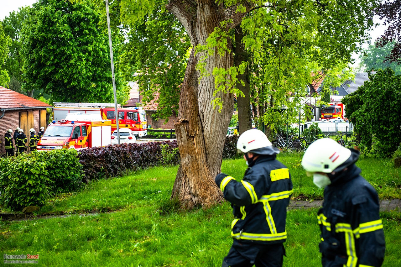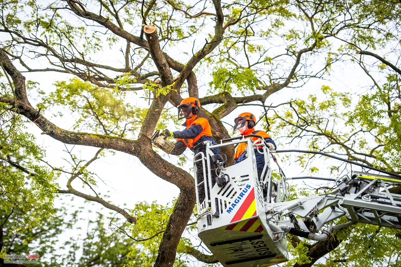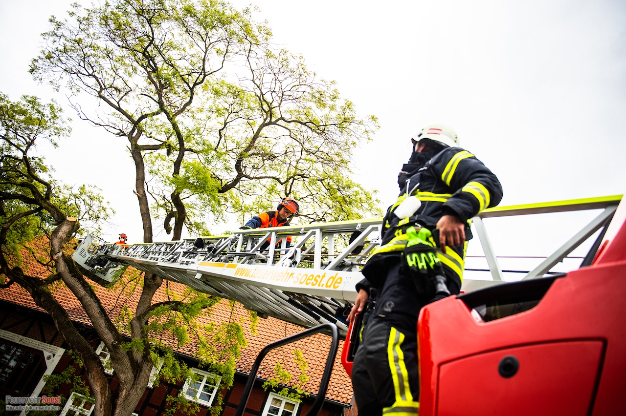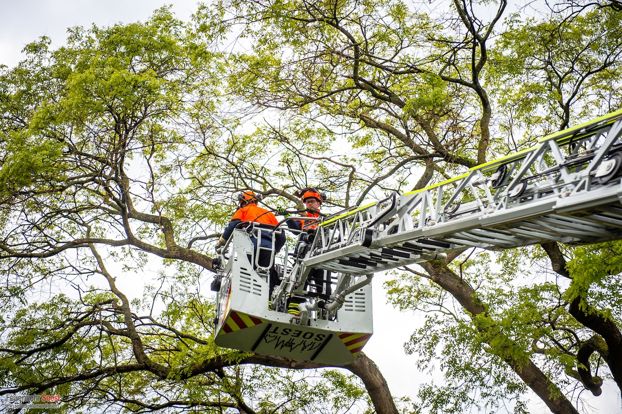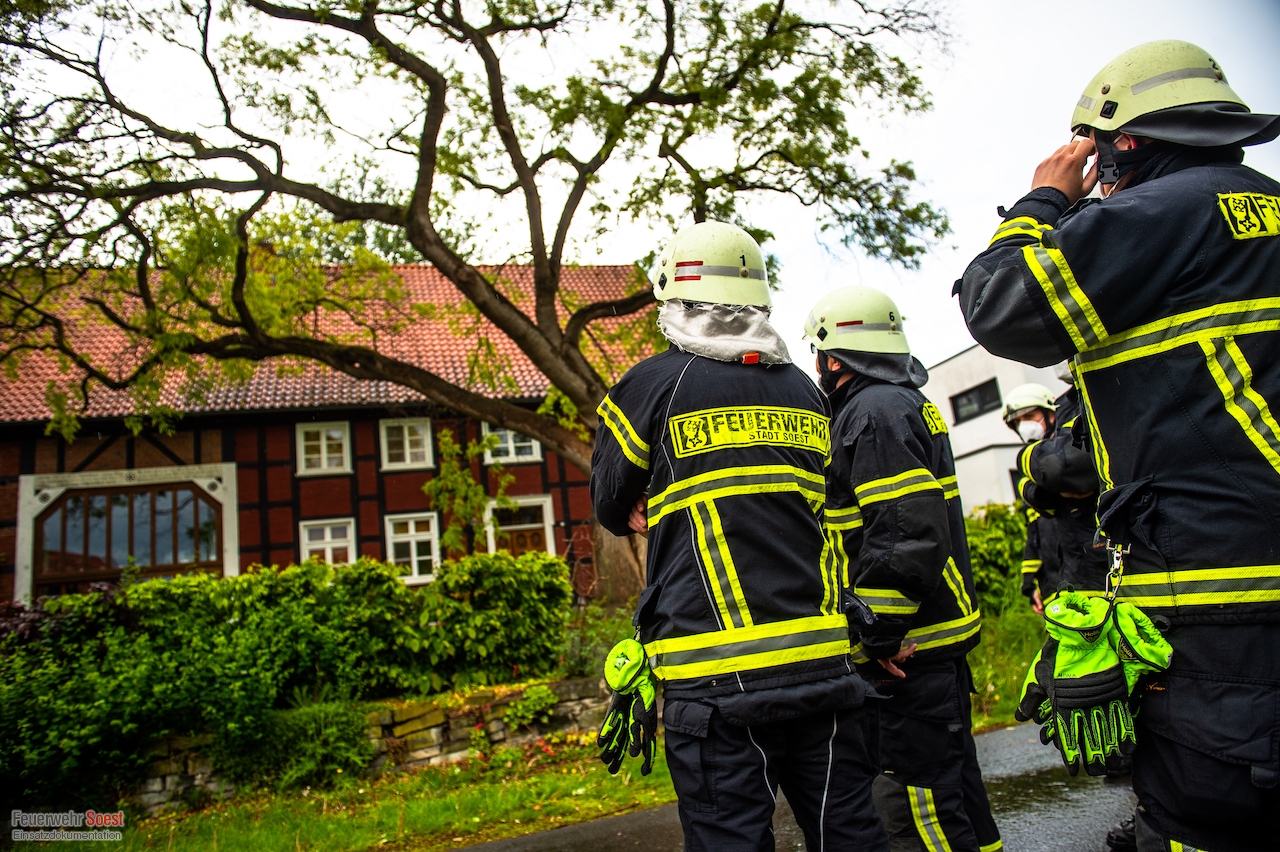 Nach einer stärkeren Sturmböe brach ein Baumstamm und drohte auf ein Fachwerkhaus zu stürzen. Der Baum wurde mittels Kettensäge uns der Drehleiter abgetragen.