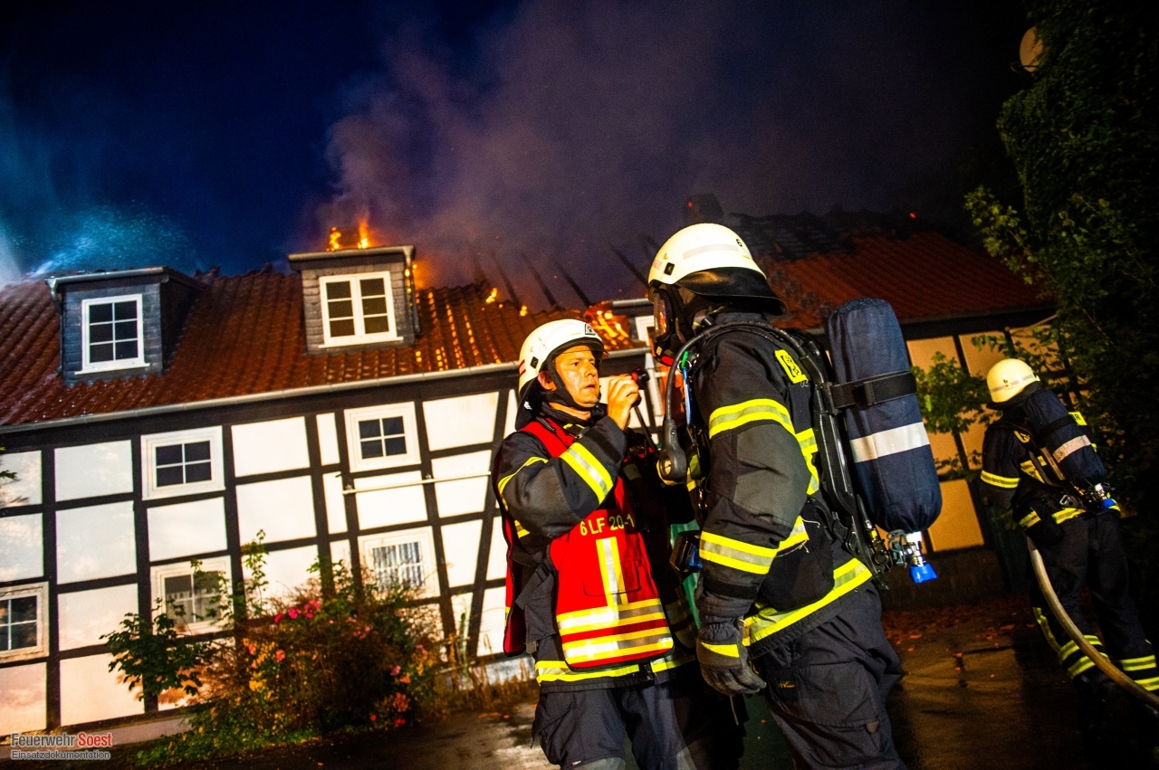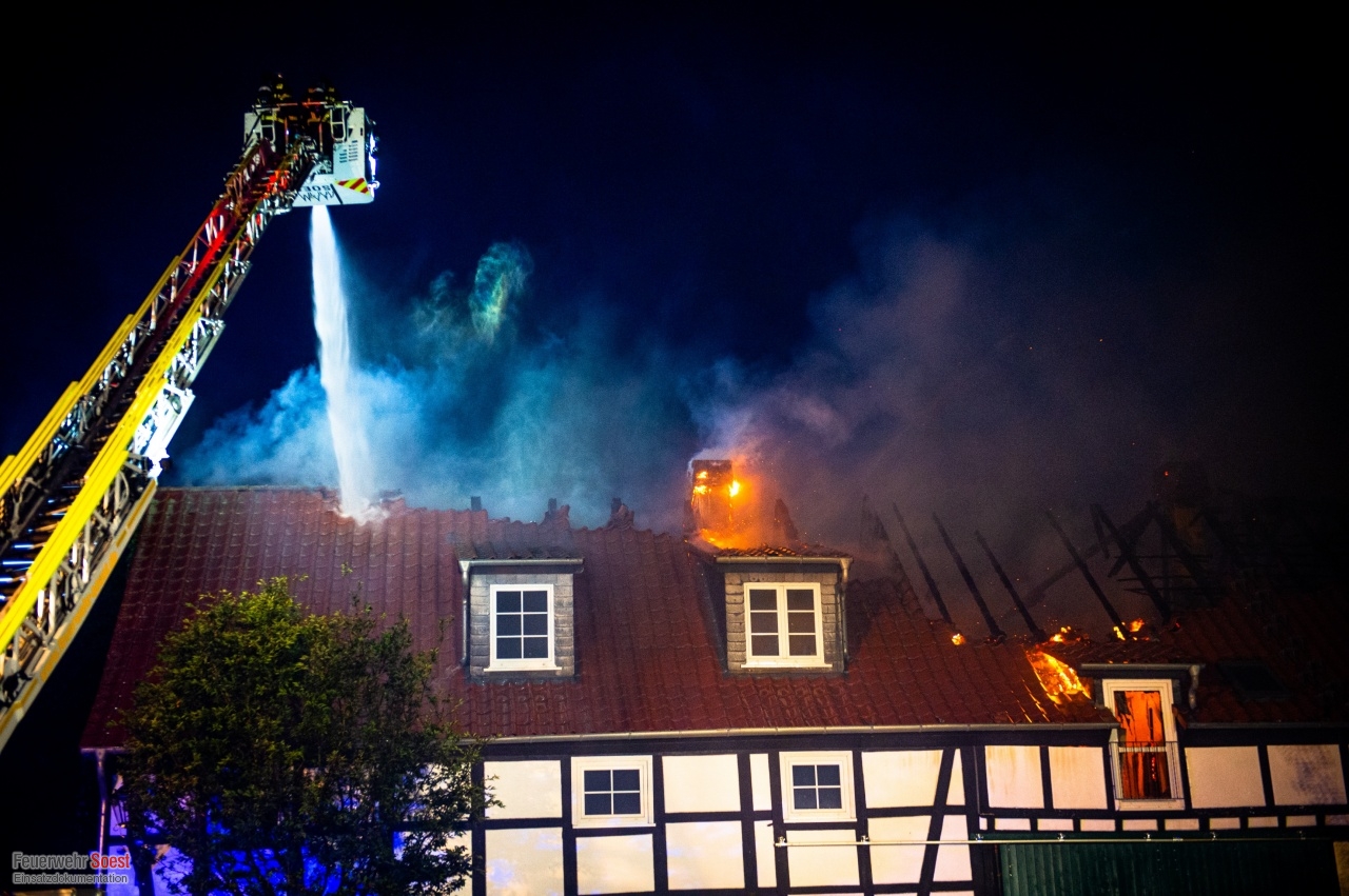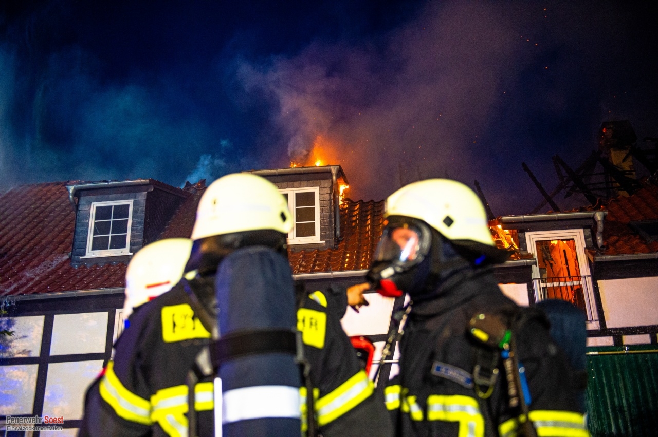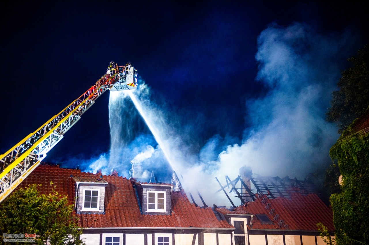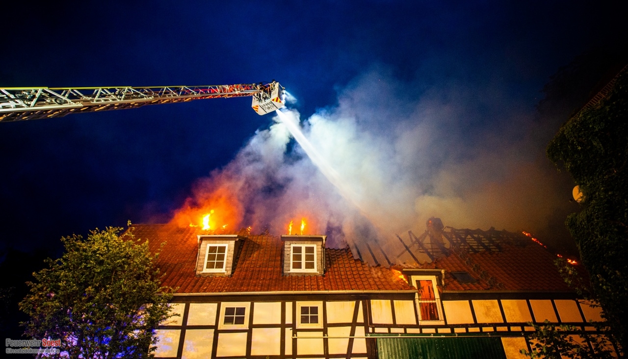 Gemeldet wurde eine Rauchentwicklung aus einem Dach. Dies konnte bereits auf der Anfahrt bestätigt werden. Nachdem die ersten Kräfte eingetroffen waren, schlugen die Flammen bereits aus dem Dachstuhl.Einen ausführlichen Beitrag gibt es beim Soester Anzeiger