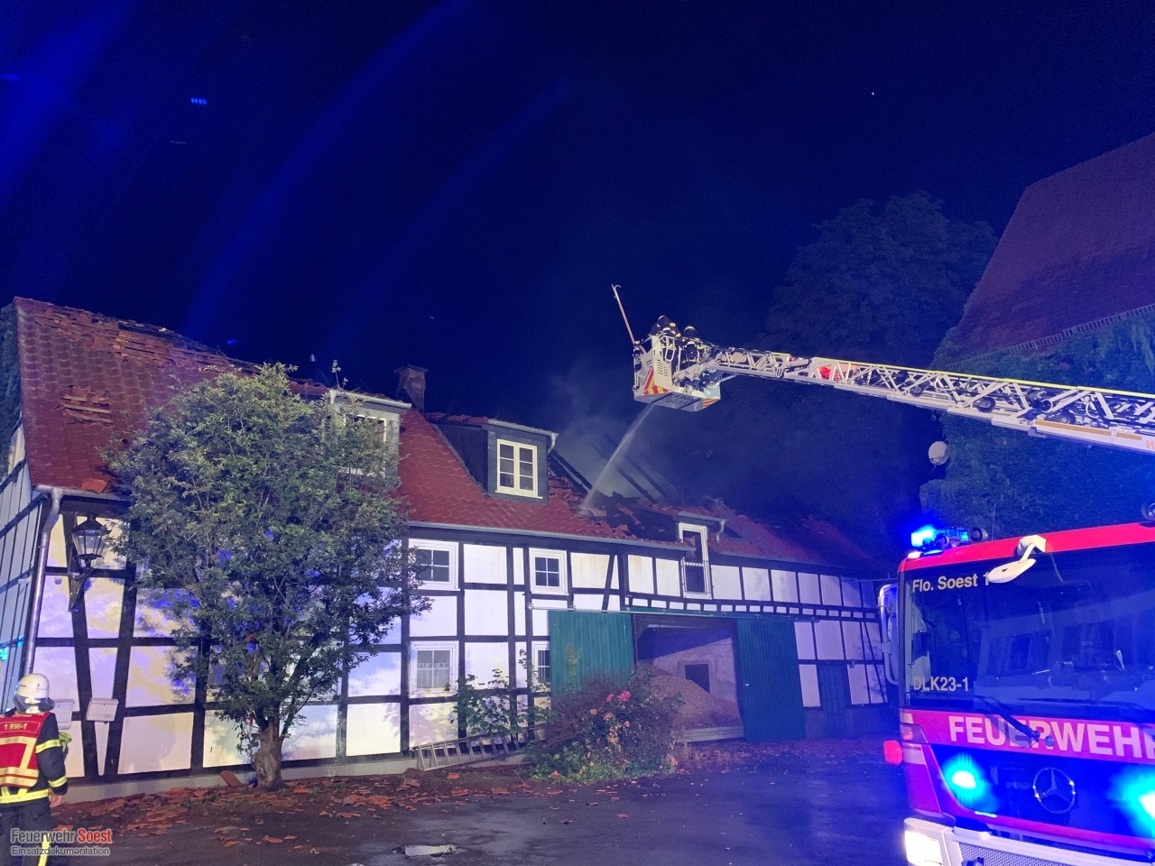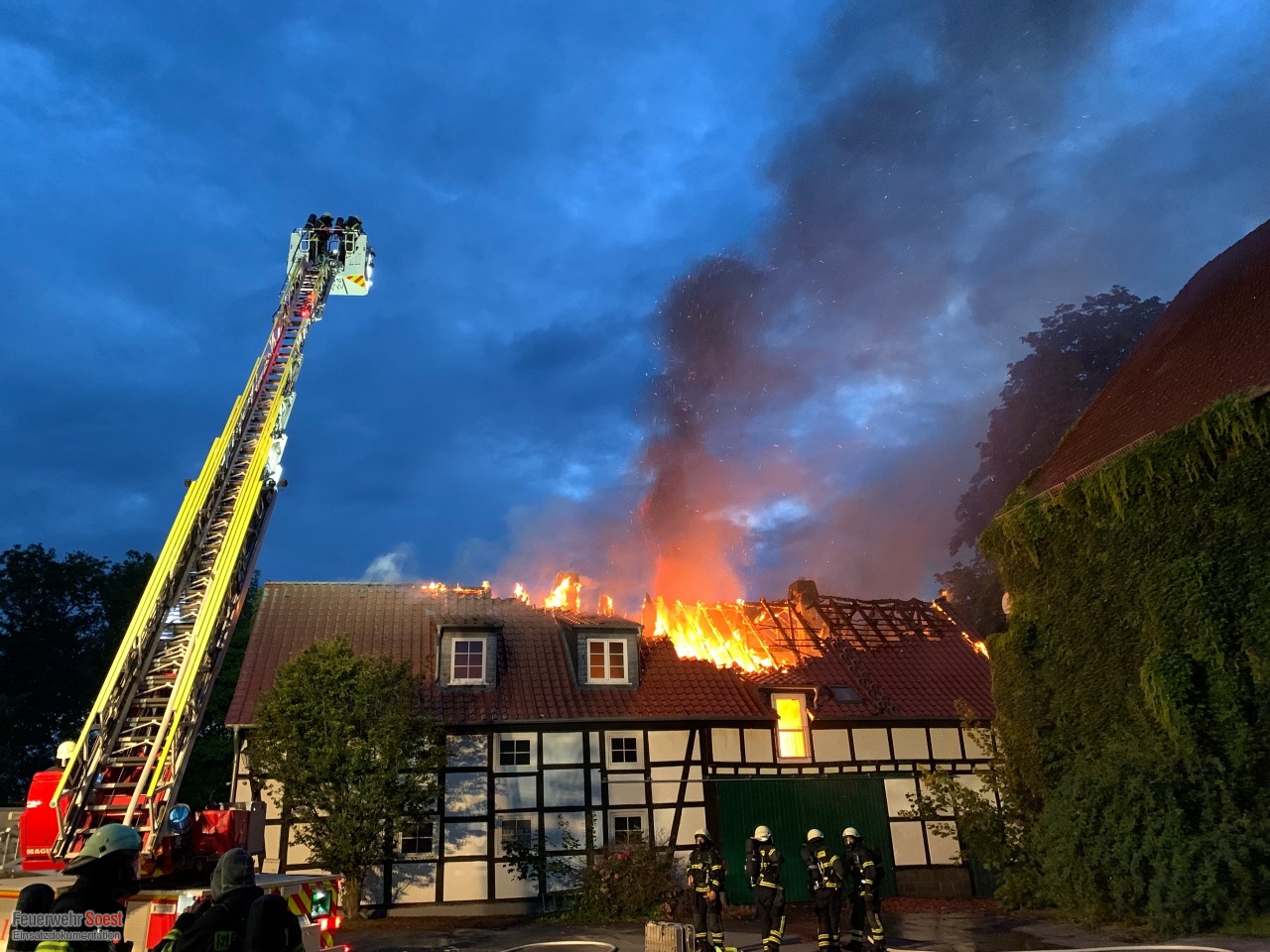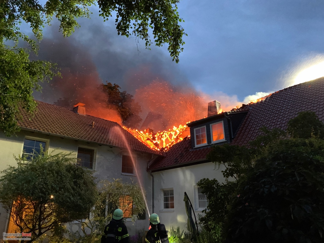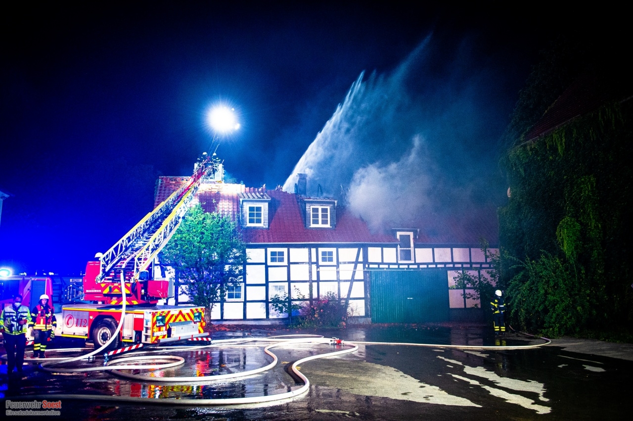 Gemeldet wurde eine Rauchentwicklung aus einem Dach. Dies konnte bereits auf der Anfahrt bestätigt werden. Nachdem die ersten Kräfte eingetroffen waren, schlugen die Flammen bereits aus dem Dachstuhl.Einen ausführlichen Beitrag gibt es beim Soester Anzeiger