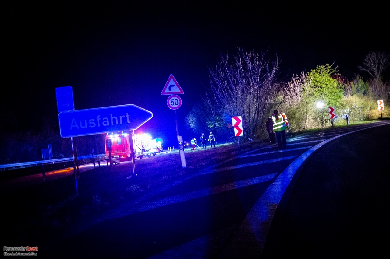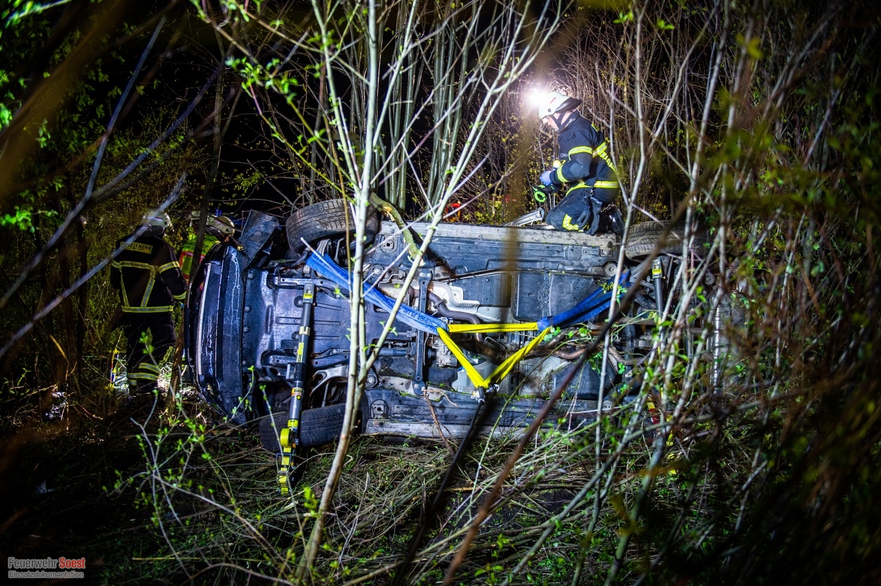 Ein Pkw war in der Auf- und Abfahrt der A44 von der Fahrbahn abgekommen und auf der Seite liegend im Gebüsch zum stehen gekommen. Durch die Kollision mit mehreren Bäumen wurde das Fahrzeug stark deformiert und der Fahrer in seinem Fahrzeug eingeklemmt. Wir sicherten das Fahrzeug mit einer Seilwinde gegen ein unkontrolliertes umkippen. Anschließend wurde der Fahrer medizinisch versorgt und danach über das Dach aus seinem Fahrzeug befreit.