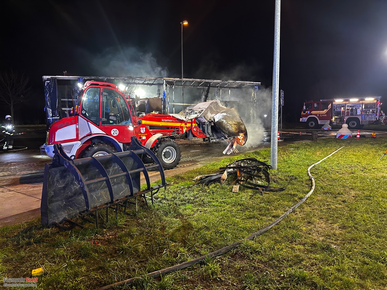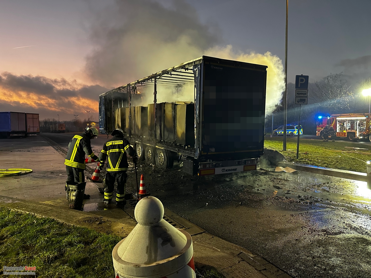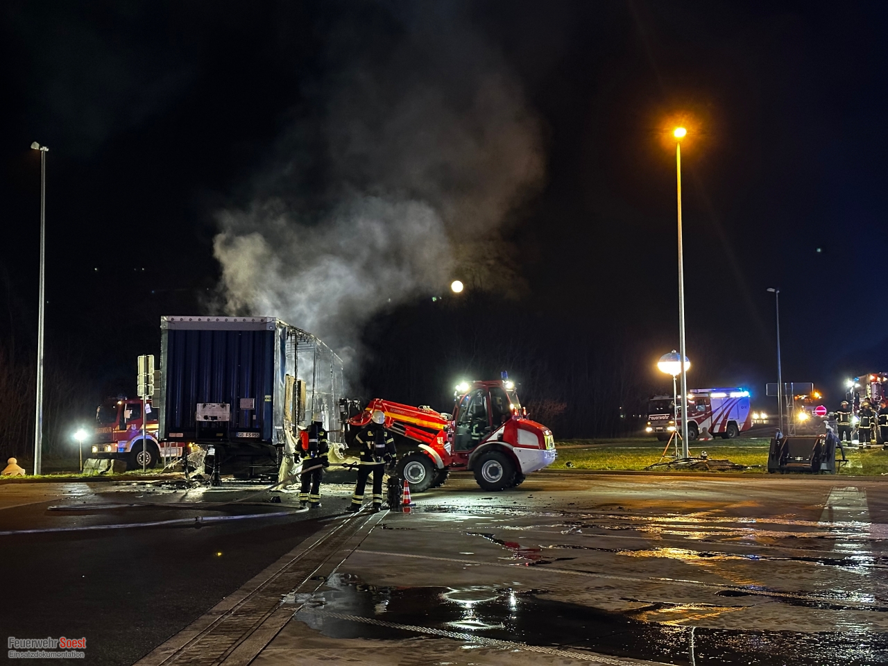 Ein Reifen an einem Lkw-Anhänger hatte sich entzündet. Der Lkw-Fahrer konnte den Auflieger schnell abkoppeln und die Zugmaschine in Sicherheit bringen. Wir führten unverzüglich eine umfangreiche Brandbekämpfung durch. Da auf der Autobahn keine Hydranten vorhanden sind, brauchten wir sehr viel Löschwasser. Dazu erhalten wir Unterstützung durch die Feuerwehr Anröchte und Möhnesee. Mit Hilfe unseres Radladers wurde die Ladung des Lkw, die aus Paletten mit Papier bestand, entladen und abgelöscht. Auch der restliche Lkw-Anhänger konnte so abgelöscht werden. Das entladene Papier wurde anschließend in einen großen Schuttcontainer umgeladen.