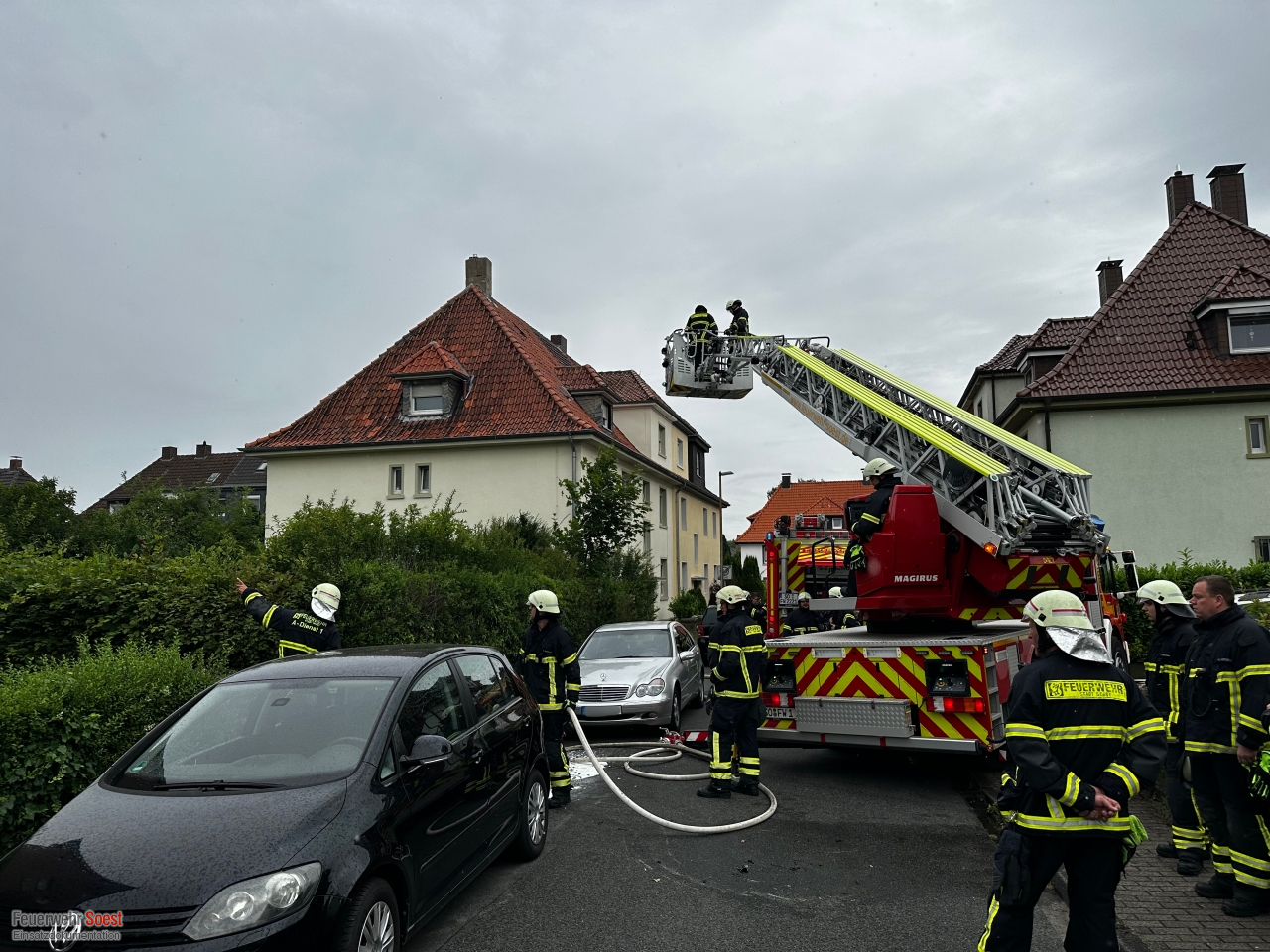Zu Beginn wurden wir mit der Alarmmeldung "Brennt Wohnhaus" alarmiert. Vor Ort stellte sich dies als drei brennende Mülltonnen am Gebäude heraus. Die Mülltonnen konnten zum größten Teil bereits durch Nachbarn mit ihren Feuerlöschern abgelöscht werden. Zwei Trupps unter Atemschutz brachten die Mülltonnen an die Straße und löschten diese weiter ab. Zusätzlich kontrollierten sie die Fassade auf etwaige Glutnester. Zusätzlich wurde der Dachbereich mit Hilfe der Drehleiter kontrolliert.
