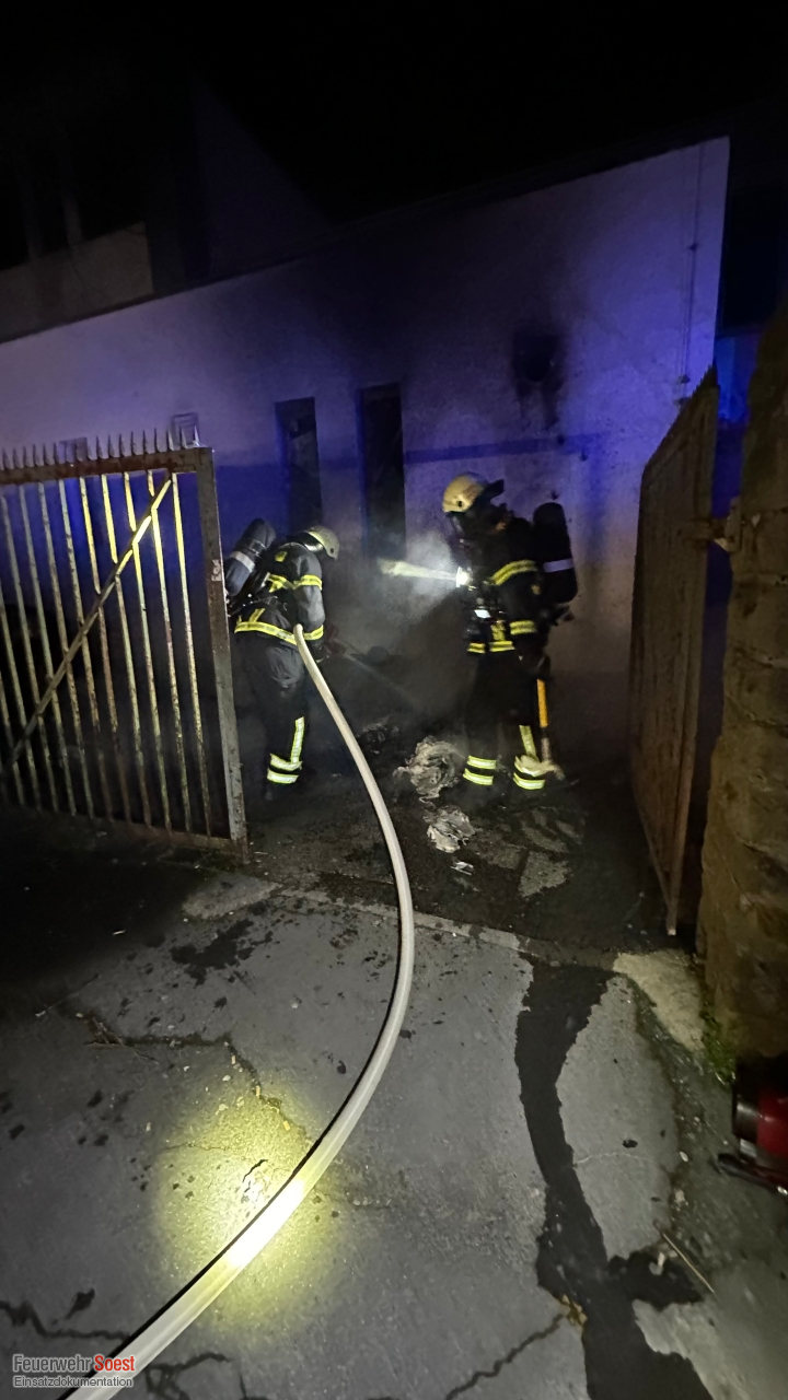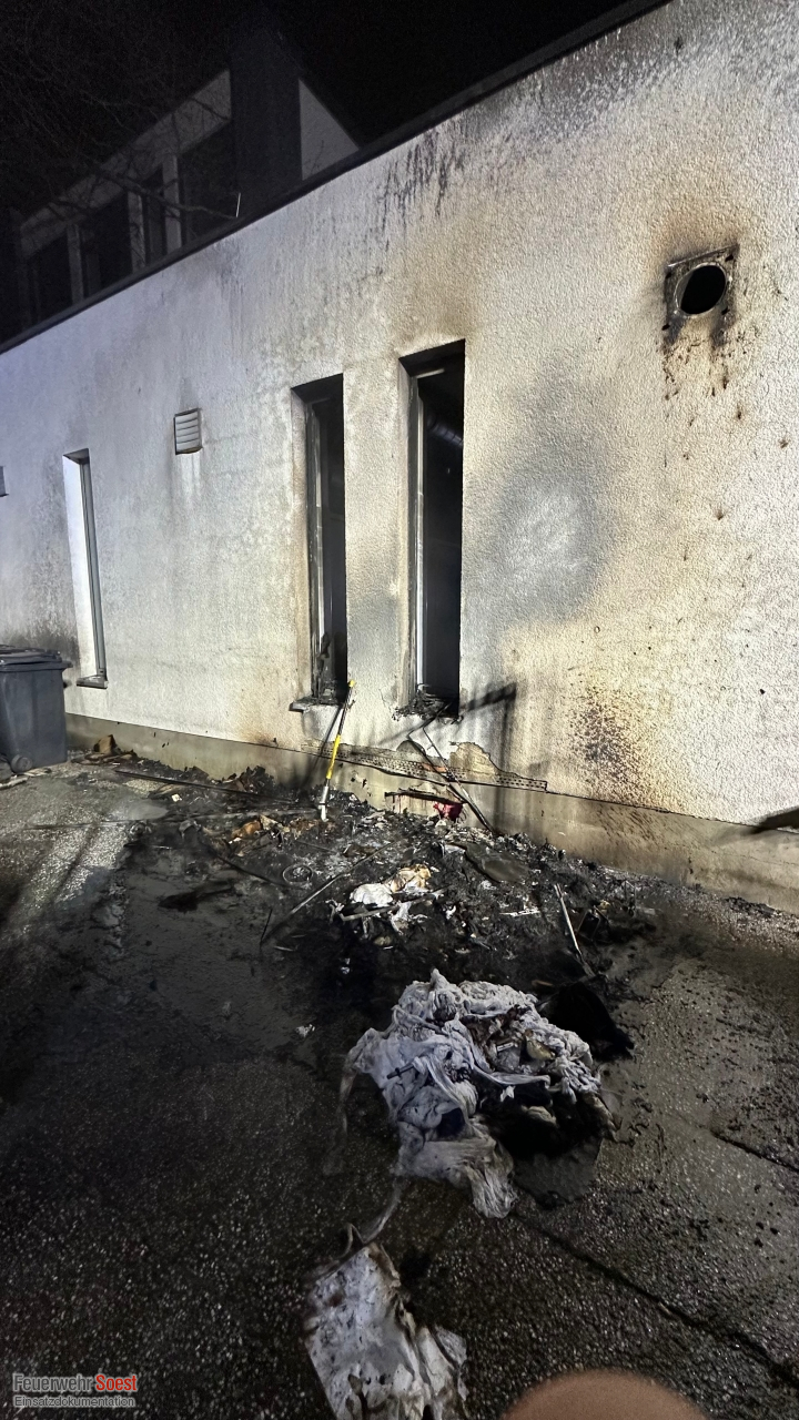 Vor einen Gebäude brennende Restmülltonnen wurden mittels C-Rohr unter schwerem Atemschutz abgelöscht. Durch das Brandereignis platzten auch zwei Scheiben des Gebäudes. Dies wurde durch einen Atemschutztrupp ohne eine Feststellung kontrolliert. In dem Gebäude wurde lediglich Lüftungsmaßnahmen durchgeführt.