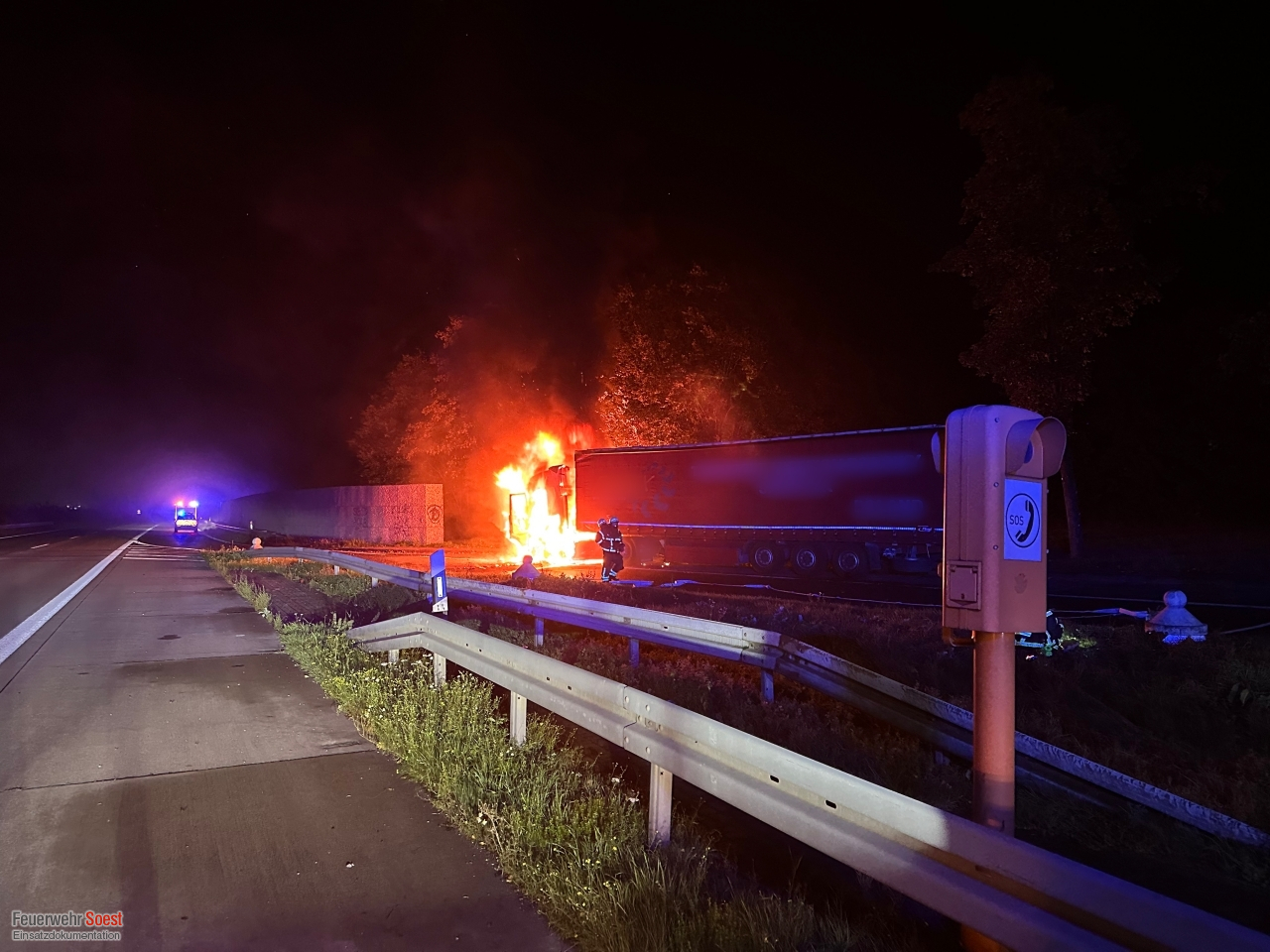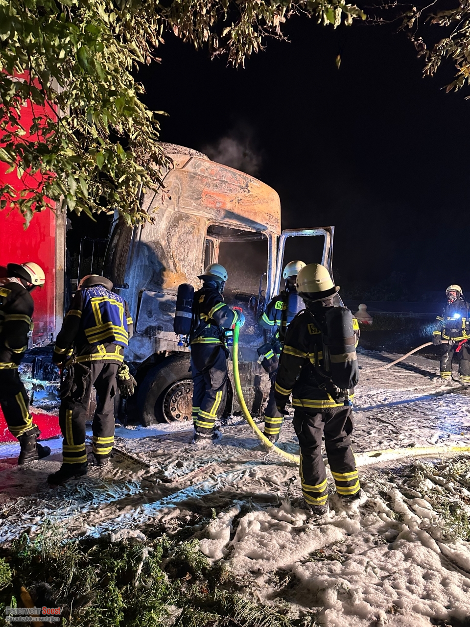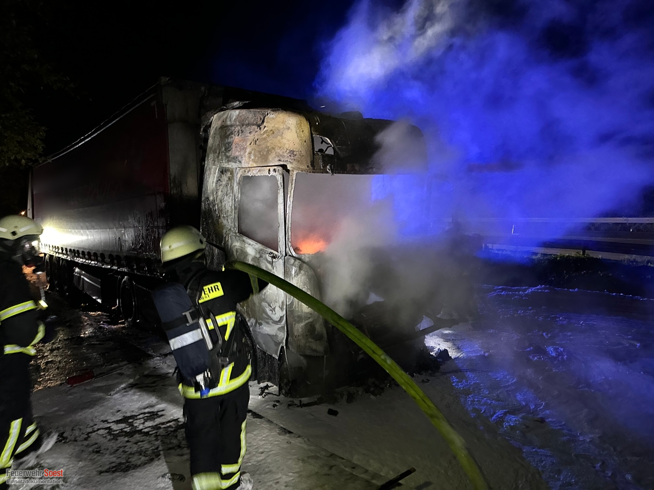 Beim Eintreffen der ersten Kräfte stand das Fahrerhaus des LKW bereits in Vollbrand. Umgehend wurde eine Brandbekämpfung mit zwei Trupps unter schwerem Atemschutz eingeleitet, um den Auflieger des LKW zu schützen. Dieses ist unseren Kräften auch gelungen. Eine Person wurde mit Verbrennungen an den Armen in ein umliegendes Krankenhaus transportiert.