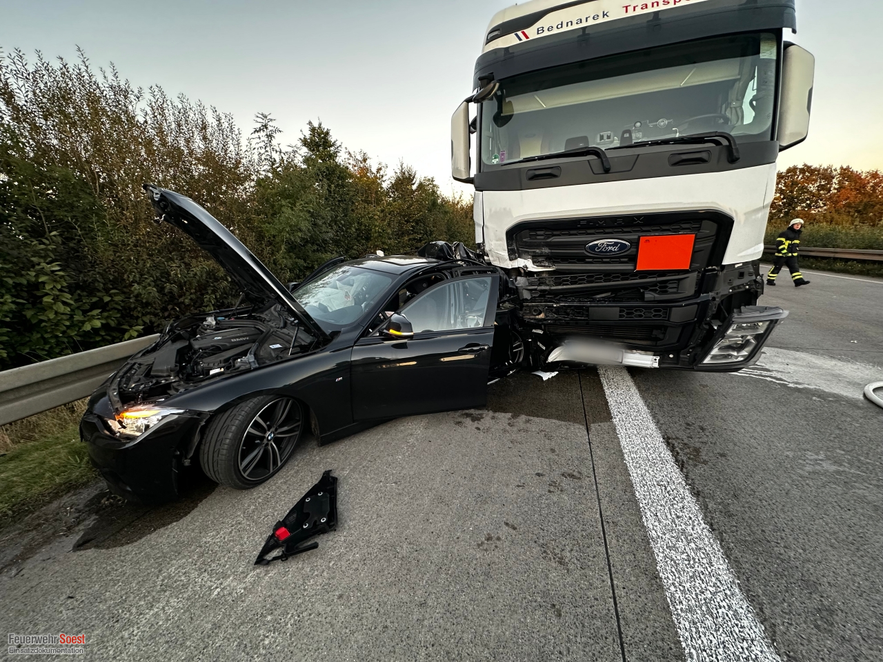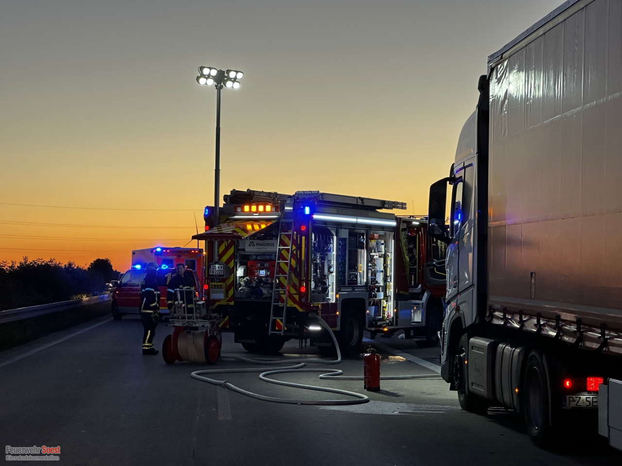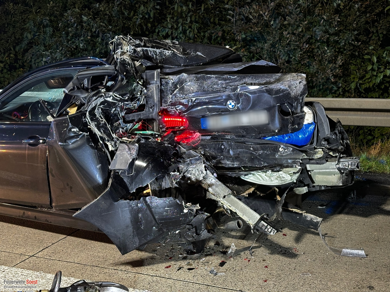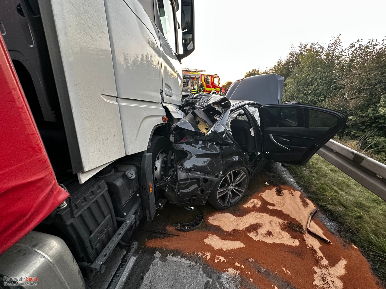 Auf der A44 Fahrtrichtung Dortmund ist es hinter der Anschlussstelle Soest-Möhnesee zu einem schweren Verkehrsunfall gekommen. Ein Lkw war auf einen Pkw aufgefahren und hat diesen massiv verformt. Als unsere ersten Kräfte eintrafen, war eine Person noch in dem Unfallfahrzeug eingeklemmt. Zwei weitere Personen sowie der Lkw-Fahrer befanden sich bereits außerhalb der Fahrzeuge. Ein Insasse des Pkw musste vor Ort reanimiert werden. Die eingeklemmte Person war schwerstverletzt und wurde mit einem Rettungshubschrauber in ein Krankenhaus transportiert. Die dritte Person aus dem Pkw war ebenfalls schwer verletzt und wurde mit einem Rettungswagen in ein Krankenhaus transportiert. Der Lkw-Fahrer wurde bei dem Unfall leicht verletzt und wurde auch mit einem Rettungswagen in ein umliegendes Krankenhaus transportiert. Die Person welche vor Ort reanimiert wurde, verstarb noch an der Einsatzstelle. Nachdem all unsere Maßnahmen abgeschlossen waren, leuchteten wir die Unfallstelle weiter für die Polizei aus.