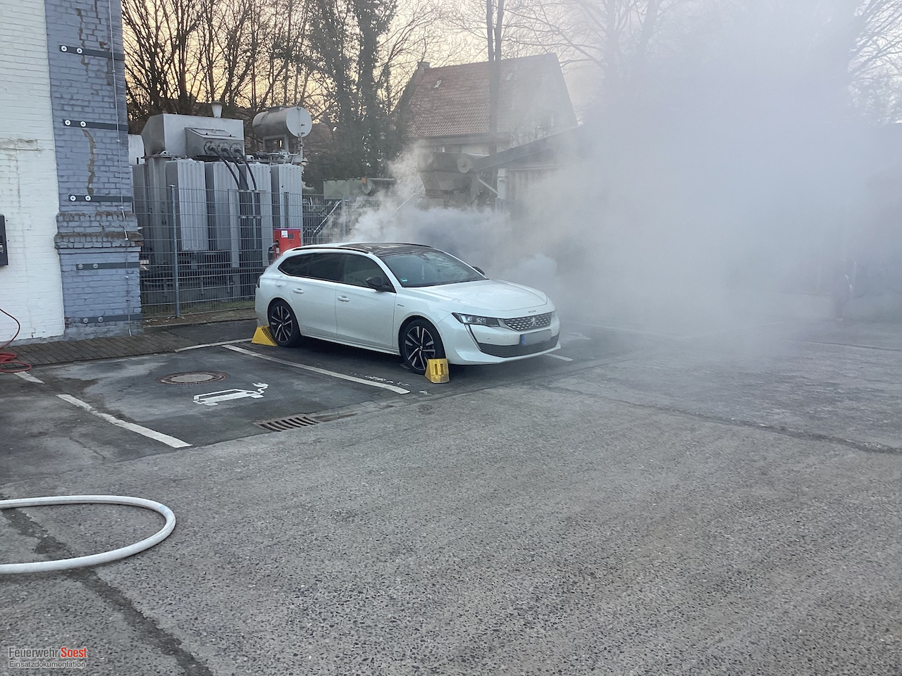 Bei Eintreffen unserer Kräfte konnte eine starke Rauchentwicklung festgestellt werden, die durch den Brand des Akkus eines Hybridfahrzeugs verursacht wurde. Da das Fahrzeug noch an der Ladesäule angeschlossen war, konnte der Brand zunächst nur durch Kühlmaßnahmen eingedämmt werden. Nach der erfolgreichen Trennung von der Ladesäule wurde der Elektroantrieb des Fahrzeugs deaktiviert.