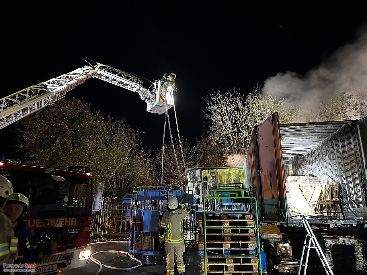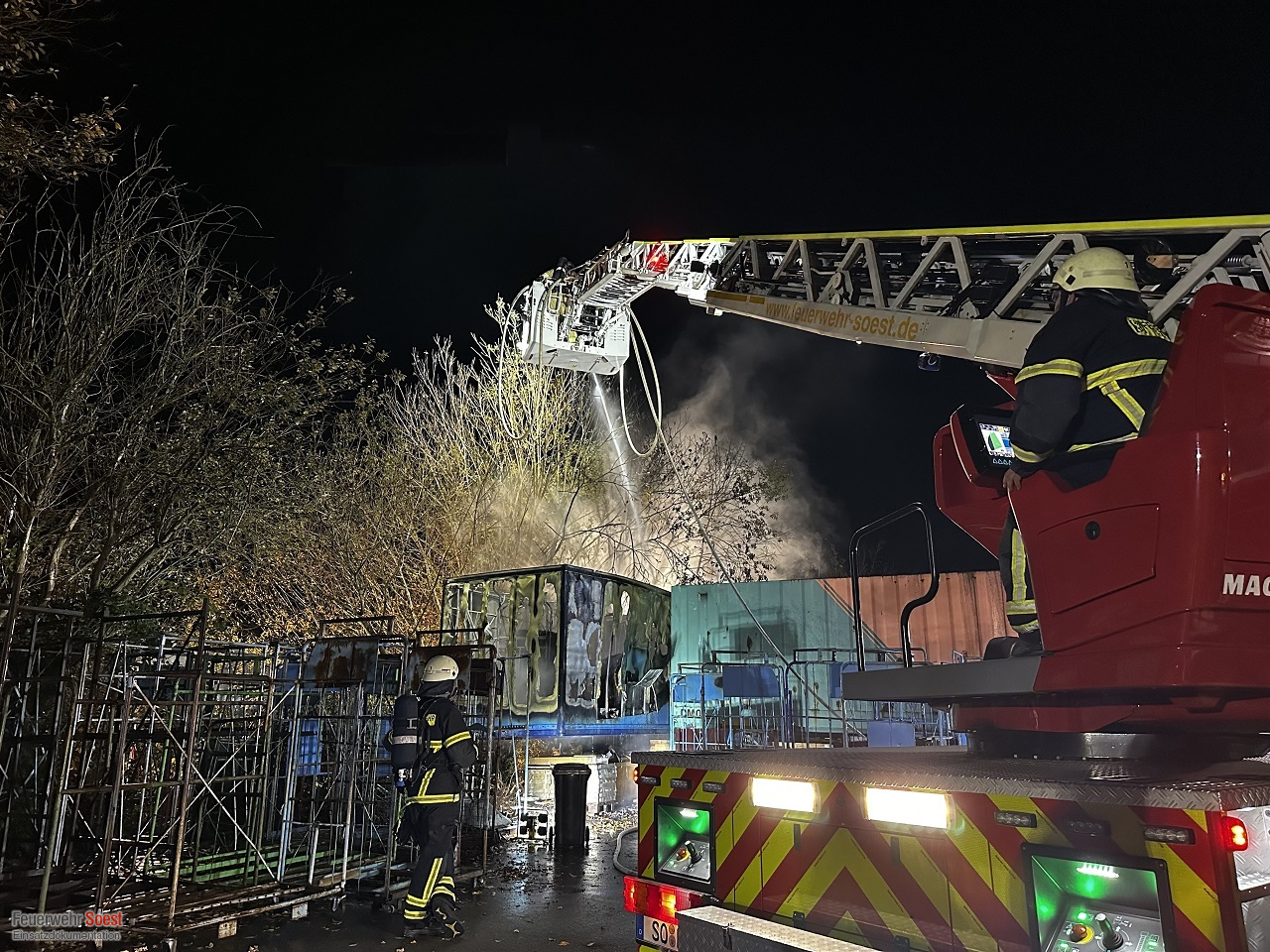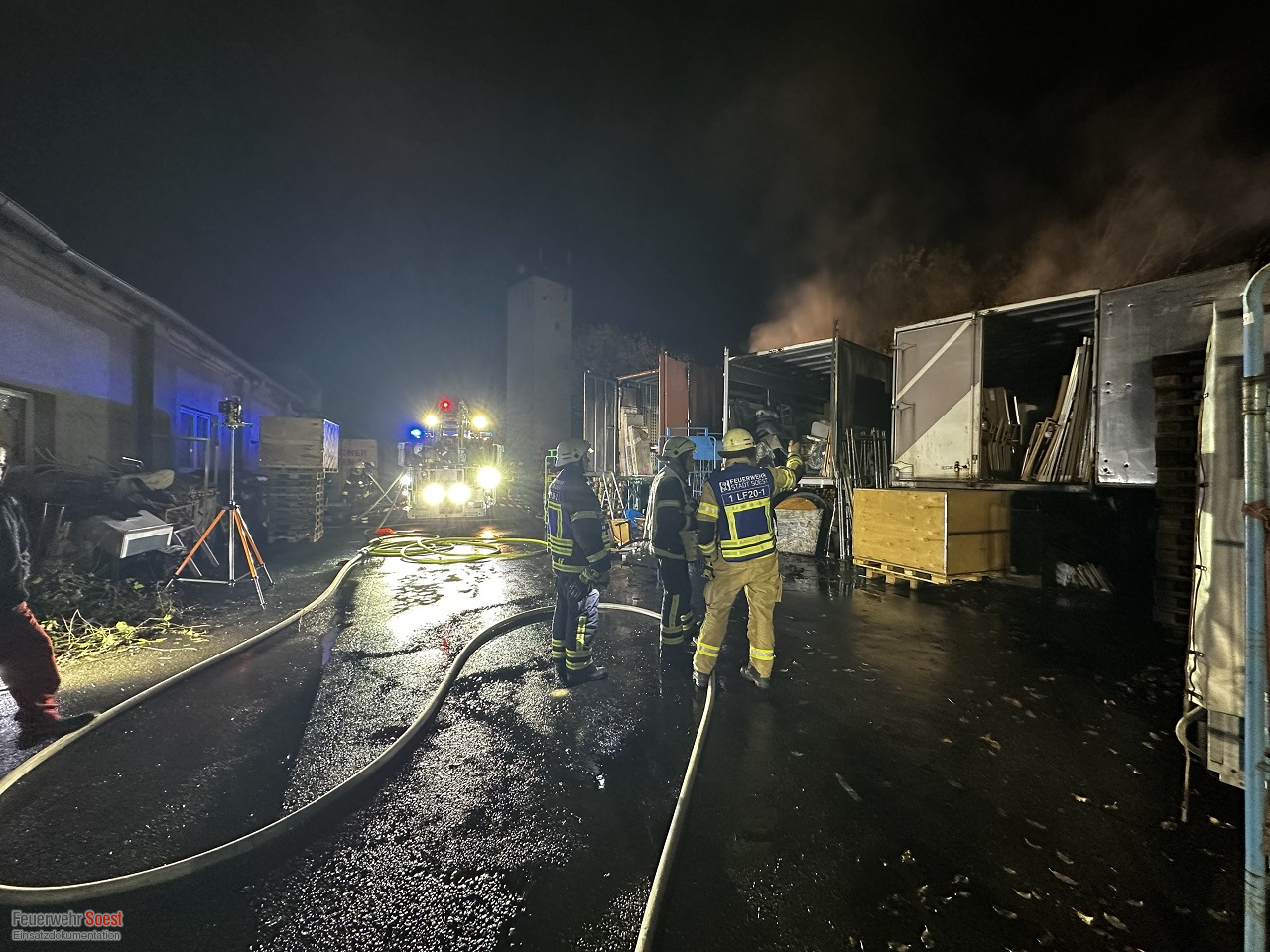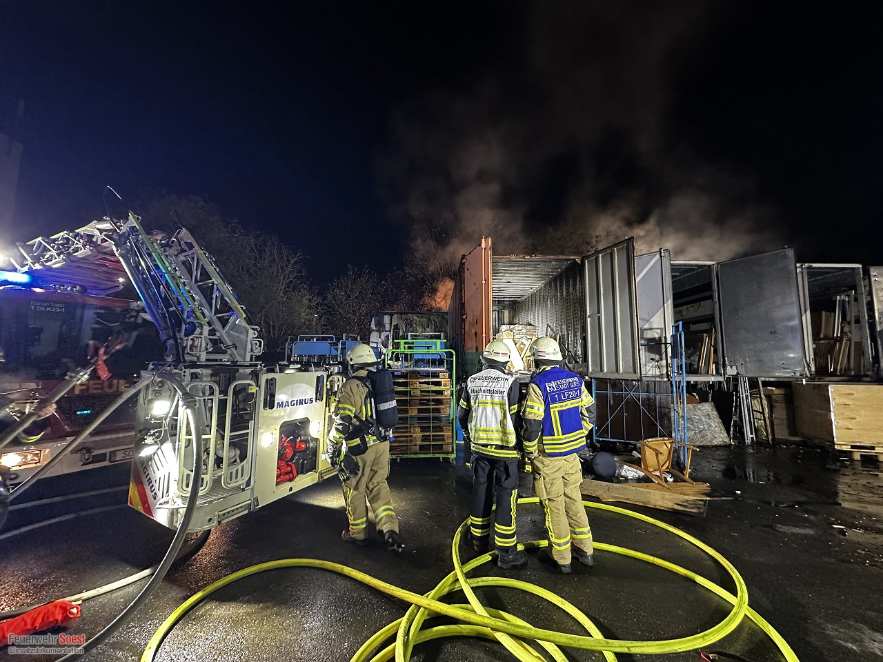 Vor Ort bot sich unseren Einsatzkräften ein deutliches Bild: Eine LKW-Wechselbrücke stand in Vollbrand. Drei weitere angrenzende Wechselbrücken waren durch die enorme Hitzeentwicklung unmittelbar bedroht. Durch das schnelle und koordinierte Eingreifen unserer Kräfte konnte ein Übergreifen der Flammen auf diese drei zusätzlichen Wechselbrücken glücklicherweise verhindert werden.