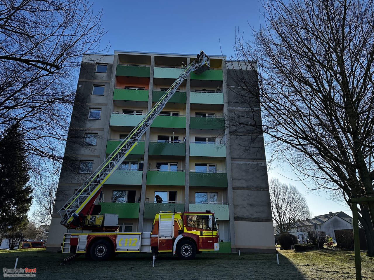 Am Montagmorgen wurde uns eine Verrauchung im 5. Obergeschoss eines Mehrfamilienhauses gemeldet. Nach Eintreffen an der Einsatzstelle gingen mehrere Trupps unter Atemschutz zur Erkundung in das Gebäude vor. Parallel dazu wurde das Objekt von außen mittels Drehleiter kontrolliert.